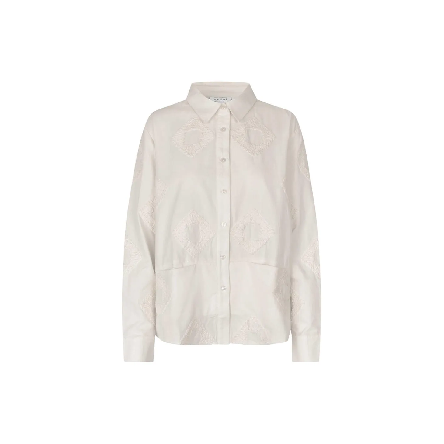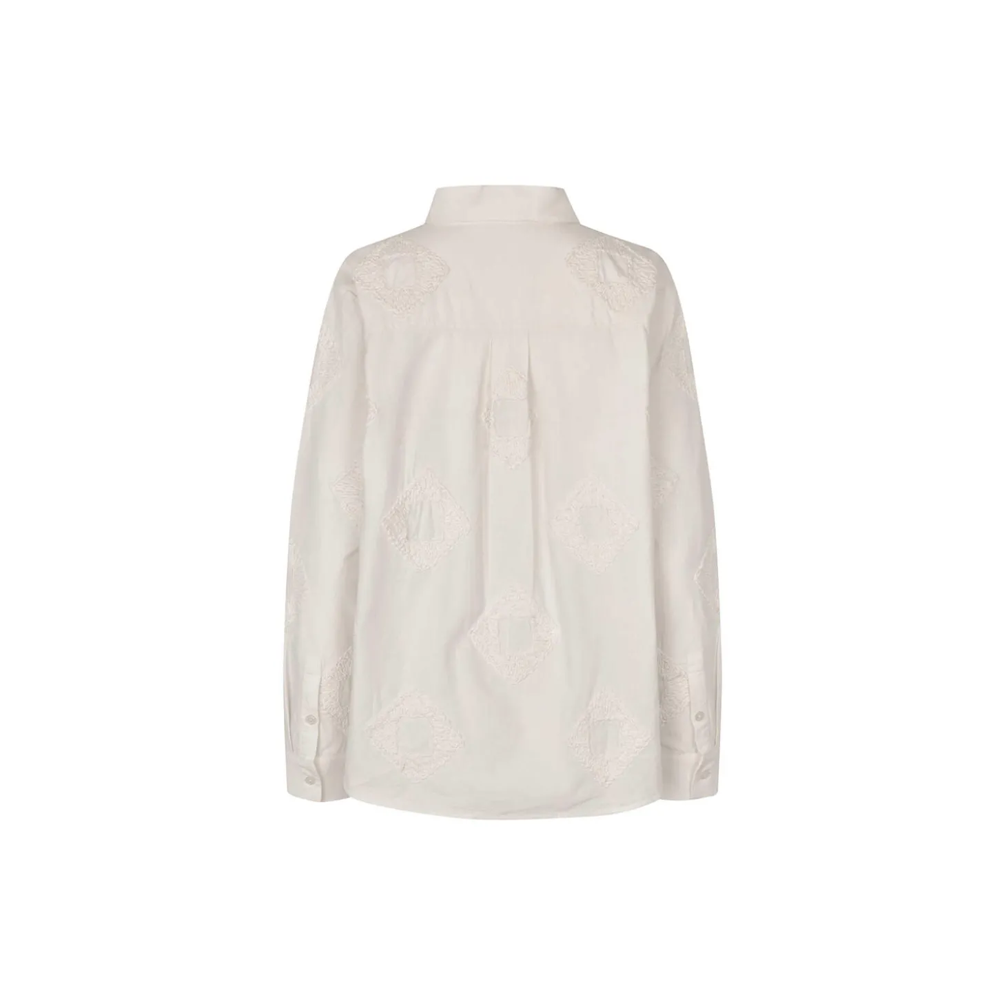 De broderede detaljer tilfører en unik tekstur til denne ensfarvede bomuldsskjorte. Den har et tidløst udtryk med lange ærmer og et klassisk lige snit, der gør den nem at style.
