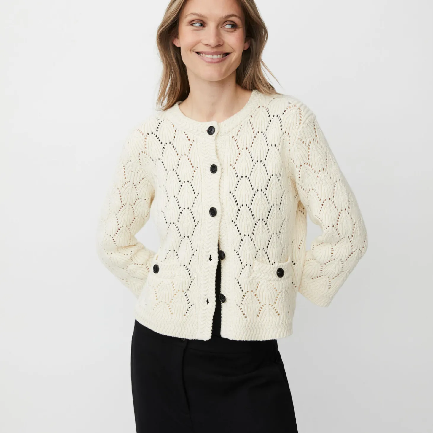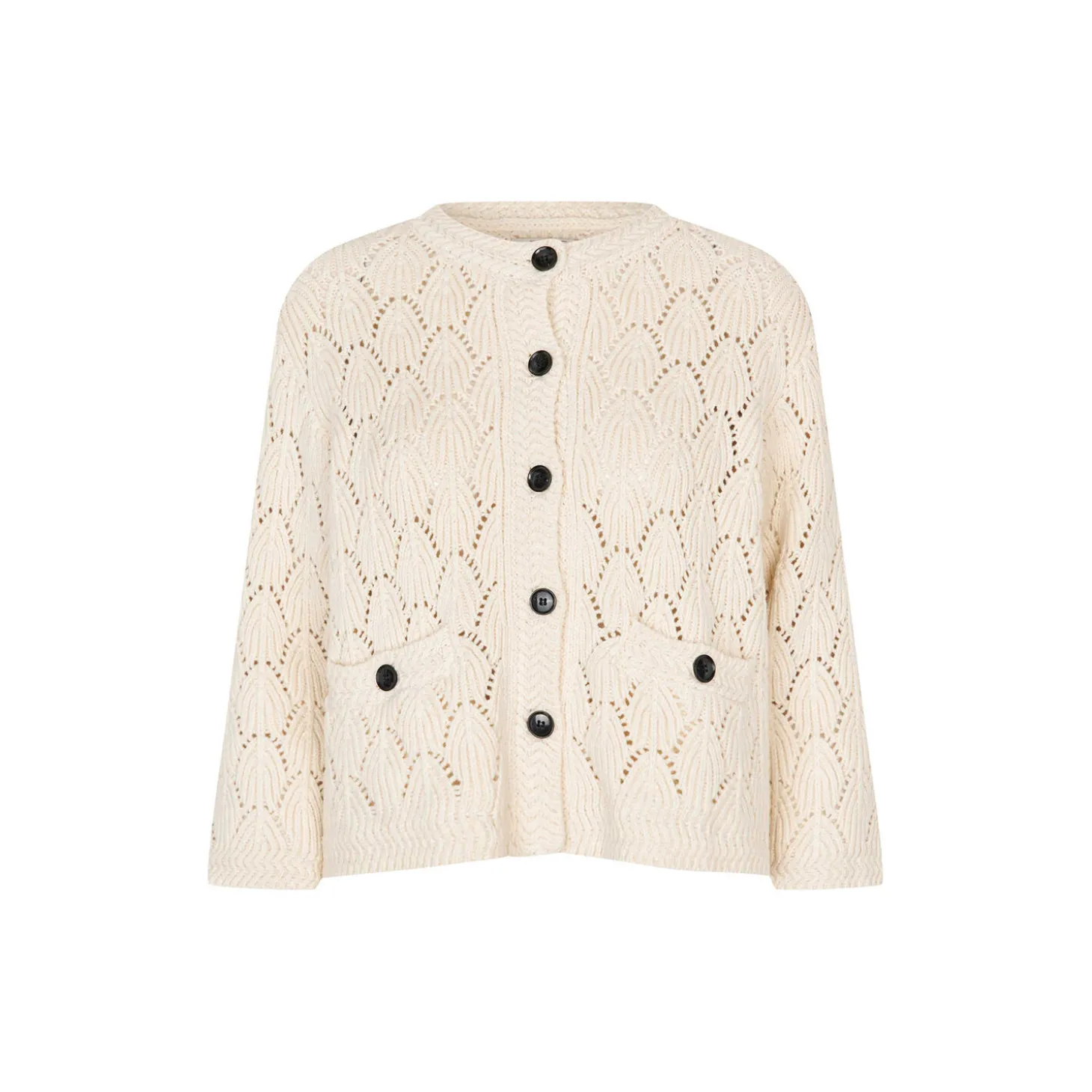 Feminin strikcardigan med hulmønster, der tilfører ubesværet elegance til din stil. Cardiganen er designet med et klassisk snit, sorte knapper, trekvartlange ærmer og fine lommer foran.