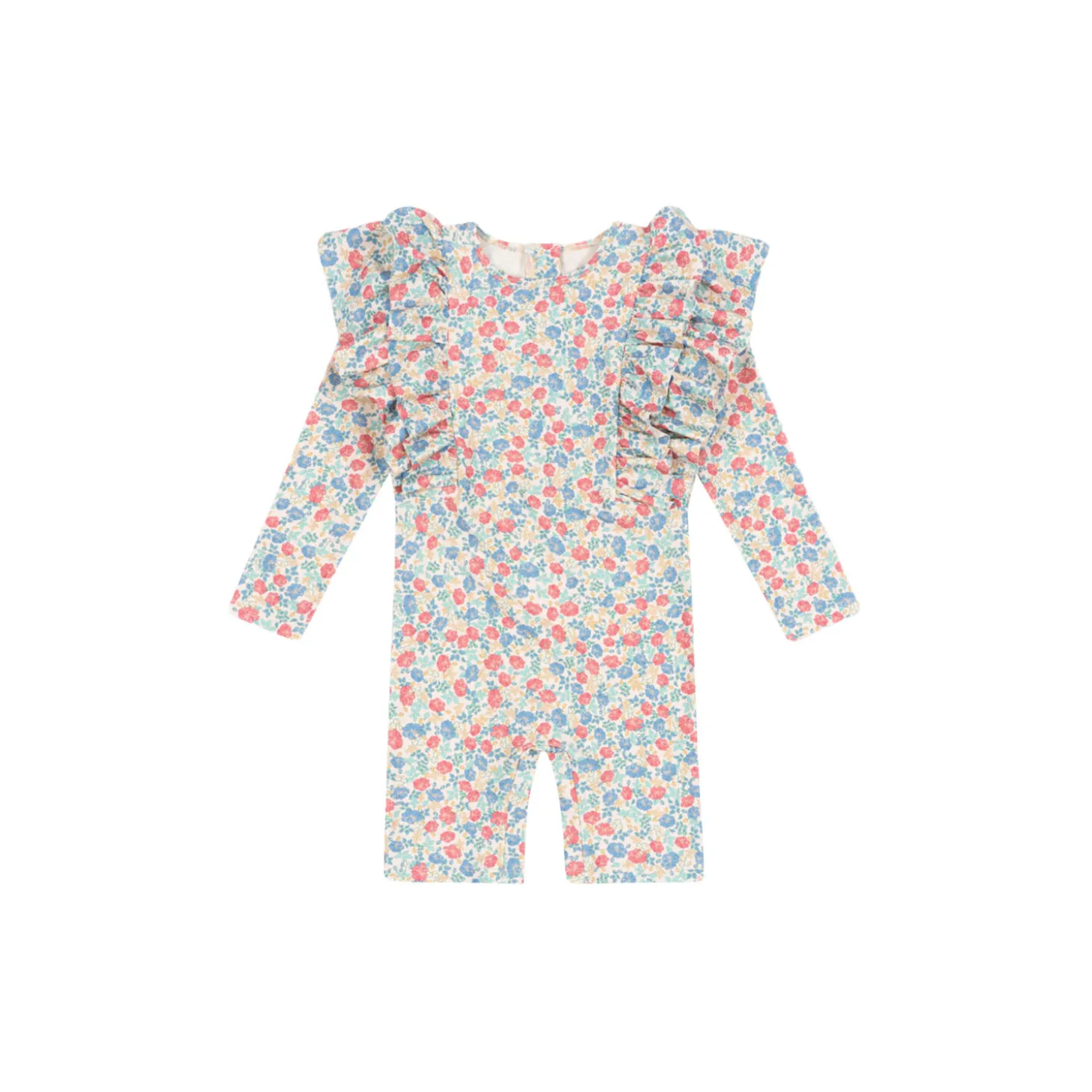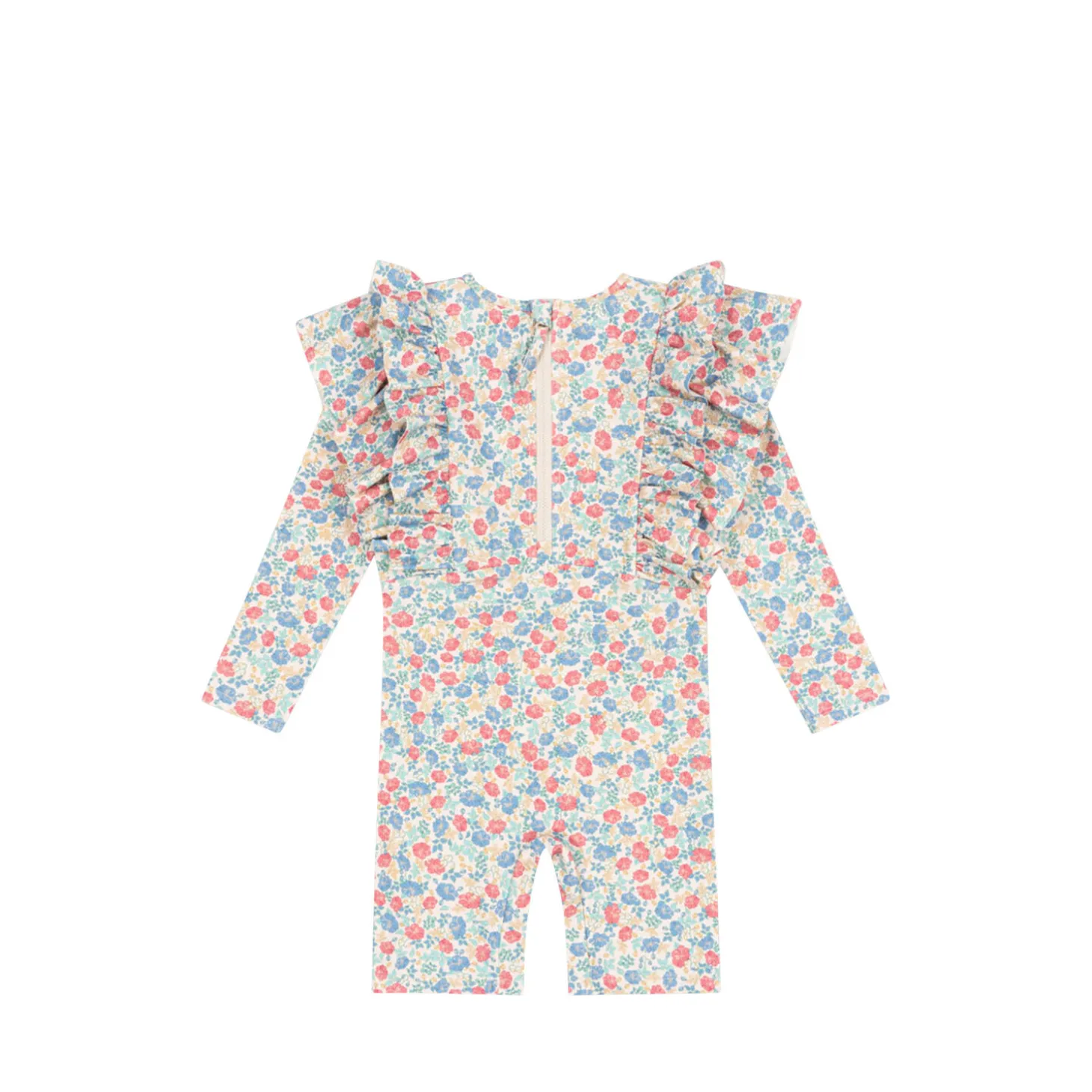 Swim onesie designed with long sleeves and frill details. Protects against the sun’s UV rays with the highest ultraviolet protection factor, UPF 50+. Materials: 80% recycled polyester, 20% elastane. This product contains 80% GRS-certified polyester, certified by CU 1094701. This product is OEKO-TEX® STANDARD 100, class 1 certified by DTI Tekstil, DTI 2276-361.