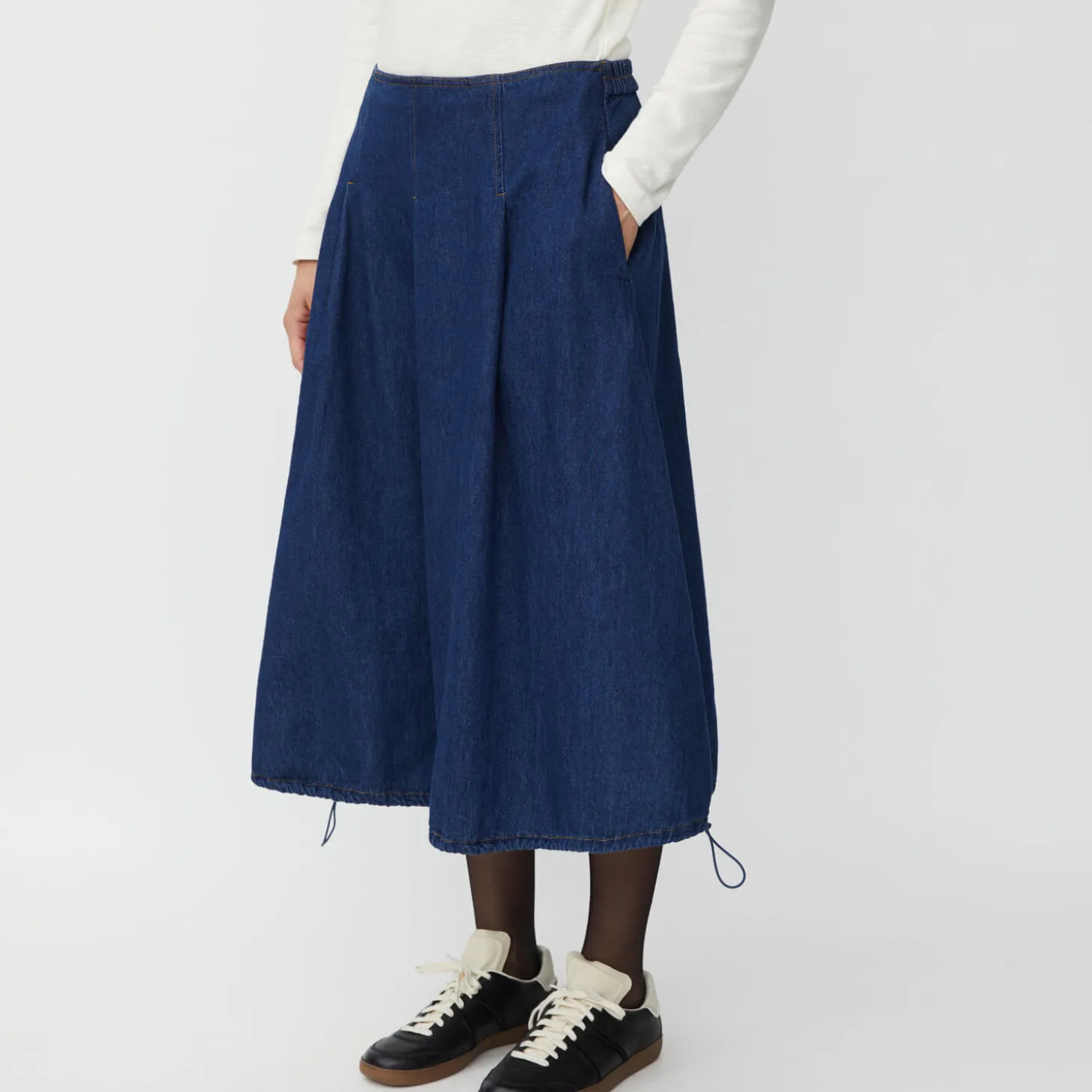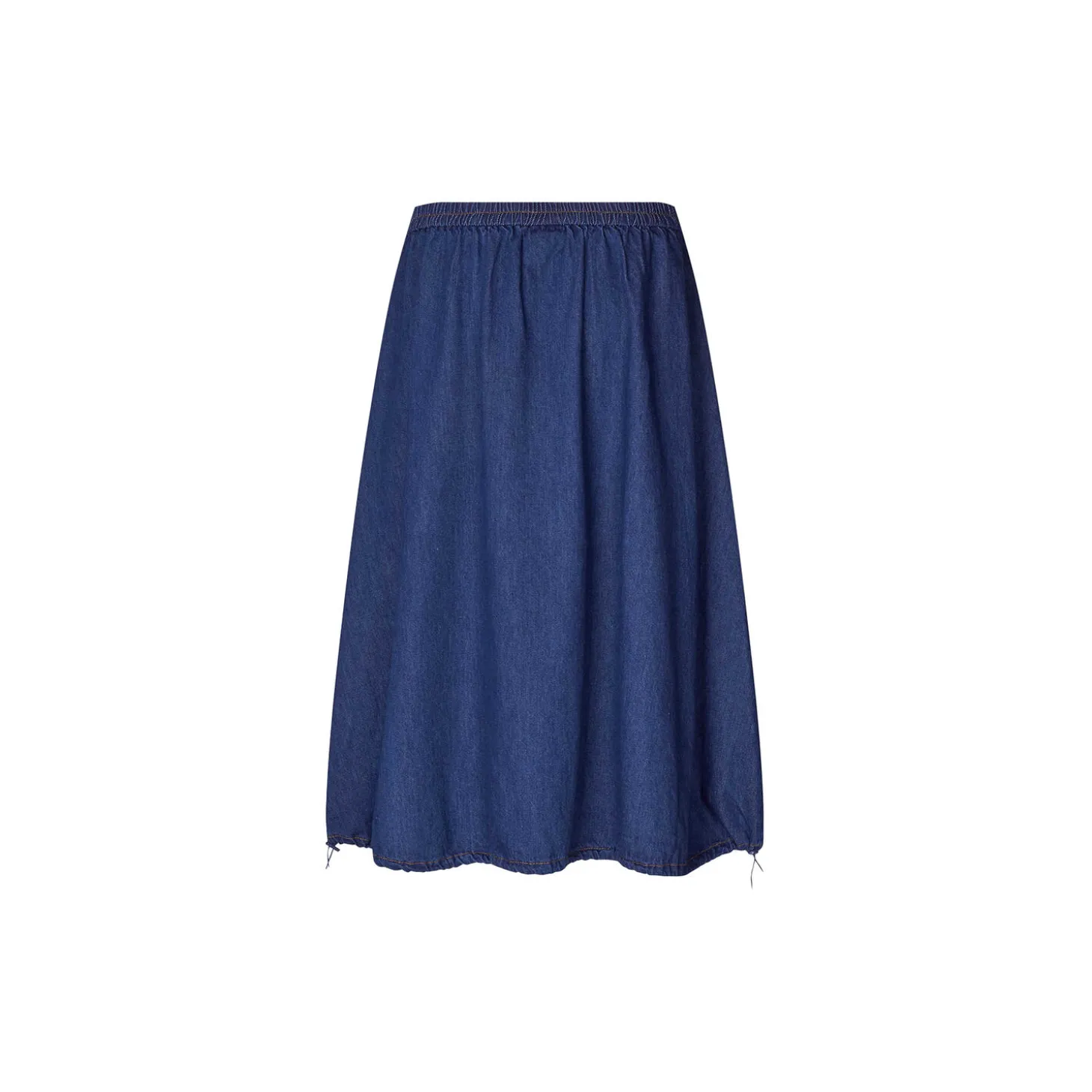 Det mørkeblå denim tilfører denne denimnederdel et elegant strejf, og ellers er den blød og behagelig at have på. Den har elastik i taljen, feminine læg foran og kan snøres ind forneden.