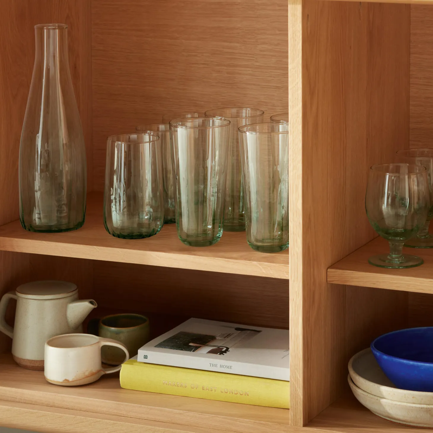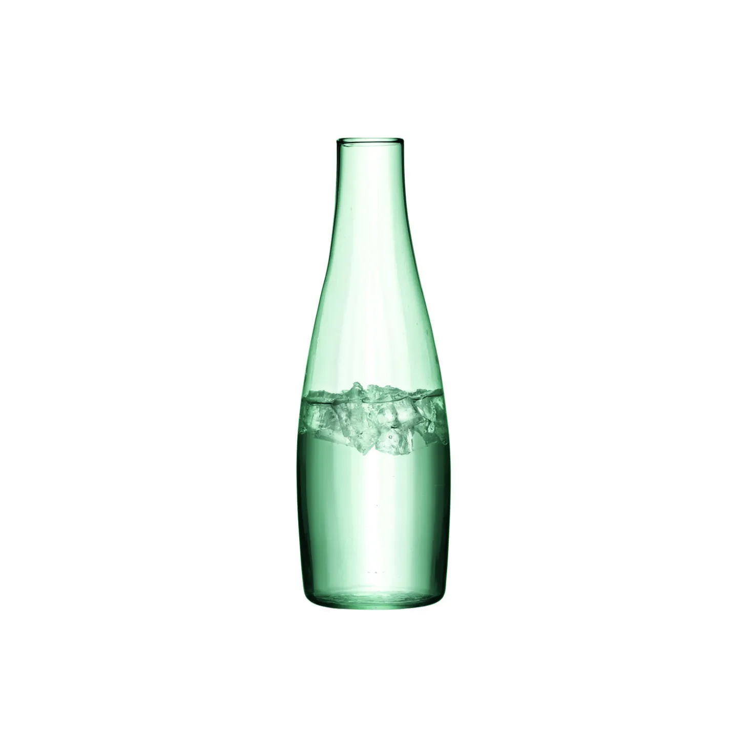 En flaskeformet karaffel med en diskret riflet tekstur. Mundblæst fra 100 % genbrugsglas, som er lokalt fremstillede af klare krukker og flasker, som sorteres, knuses og opvarmes i ovnen, indtil de er smeltet. Det blæses derefter ind i en træform for at skabe karaflen. Luftbobler vil opstå som en del af denne håndlavede proces, og 100% genbrugsglas, som producerer en subtil grøn nuance.