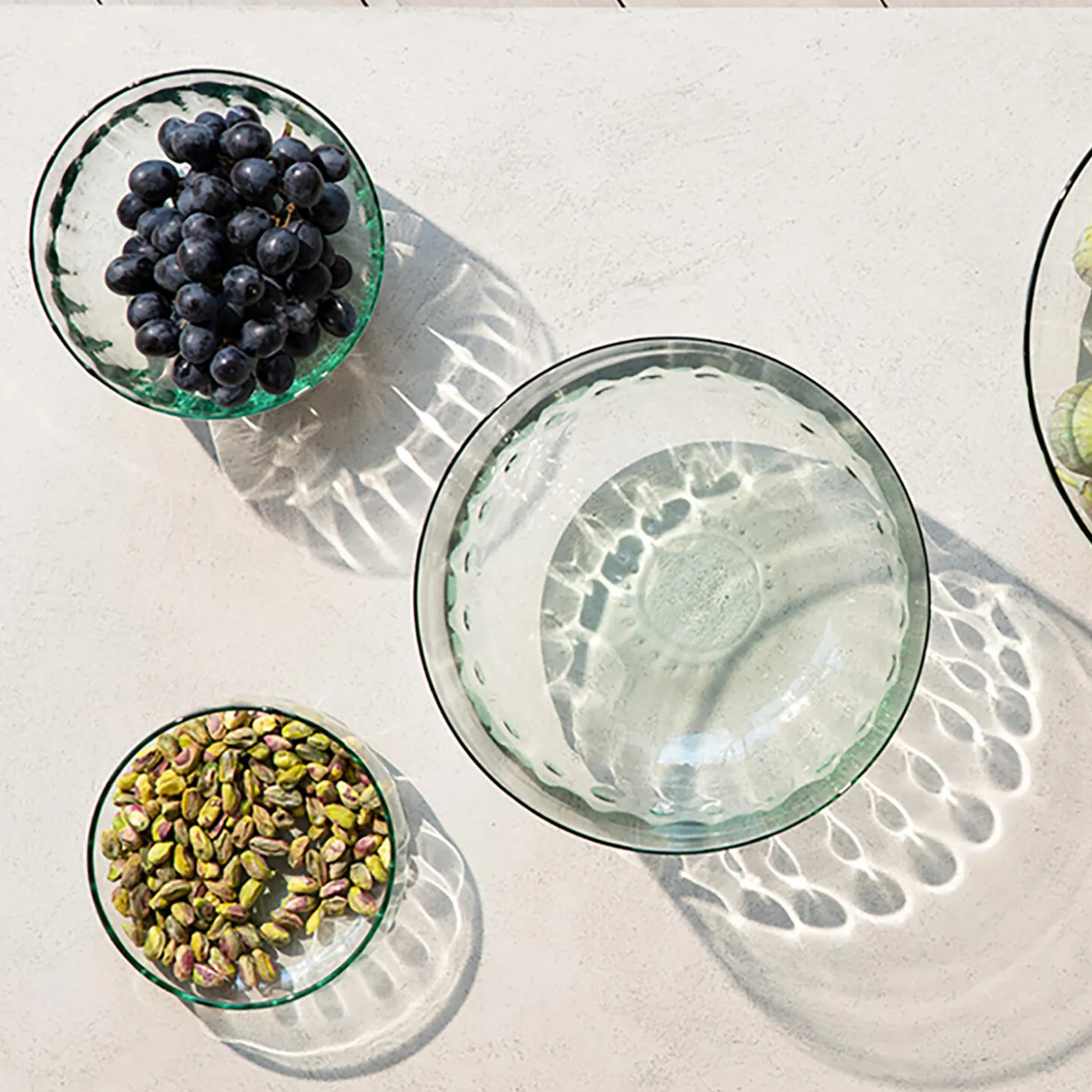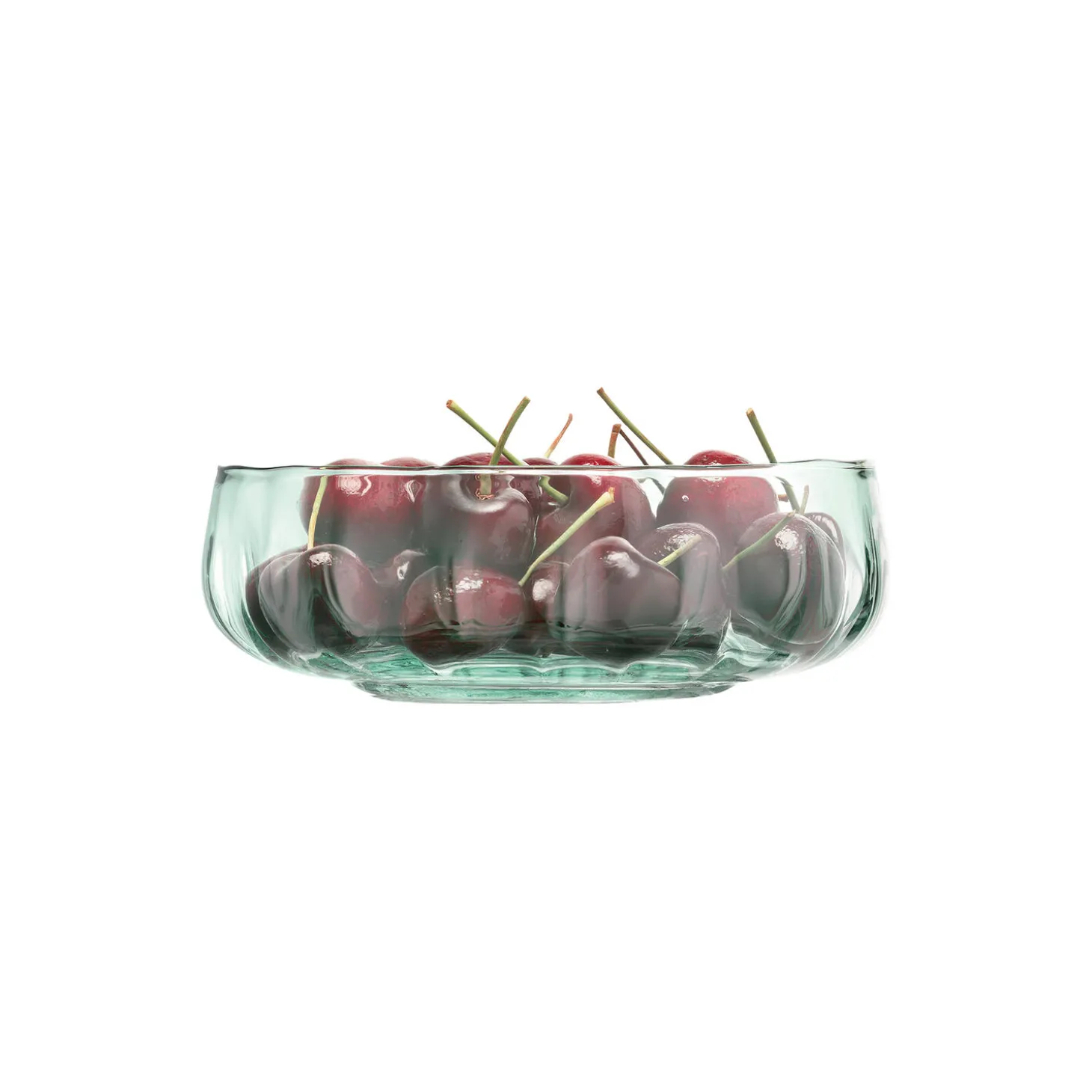 En mindre lav skål med en diskret riflet tekstur. Mundblæst af 100 % genbrugsglas, glasset har en subtil grøn nuance med et par luftbobler til stede, karakteristisk for den håndlavede proces. Til servering af salat eller fremvisning af frugt.