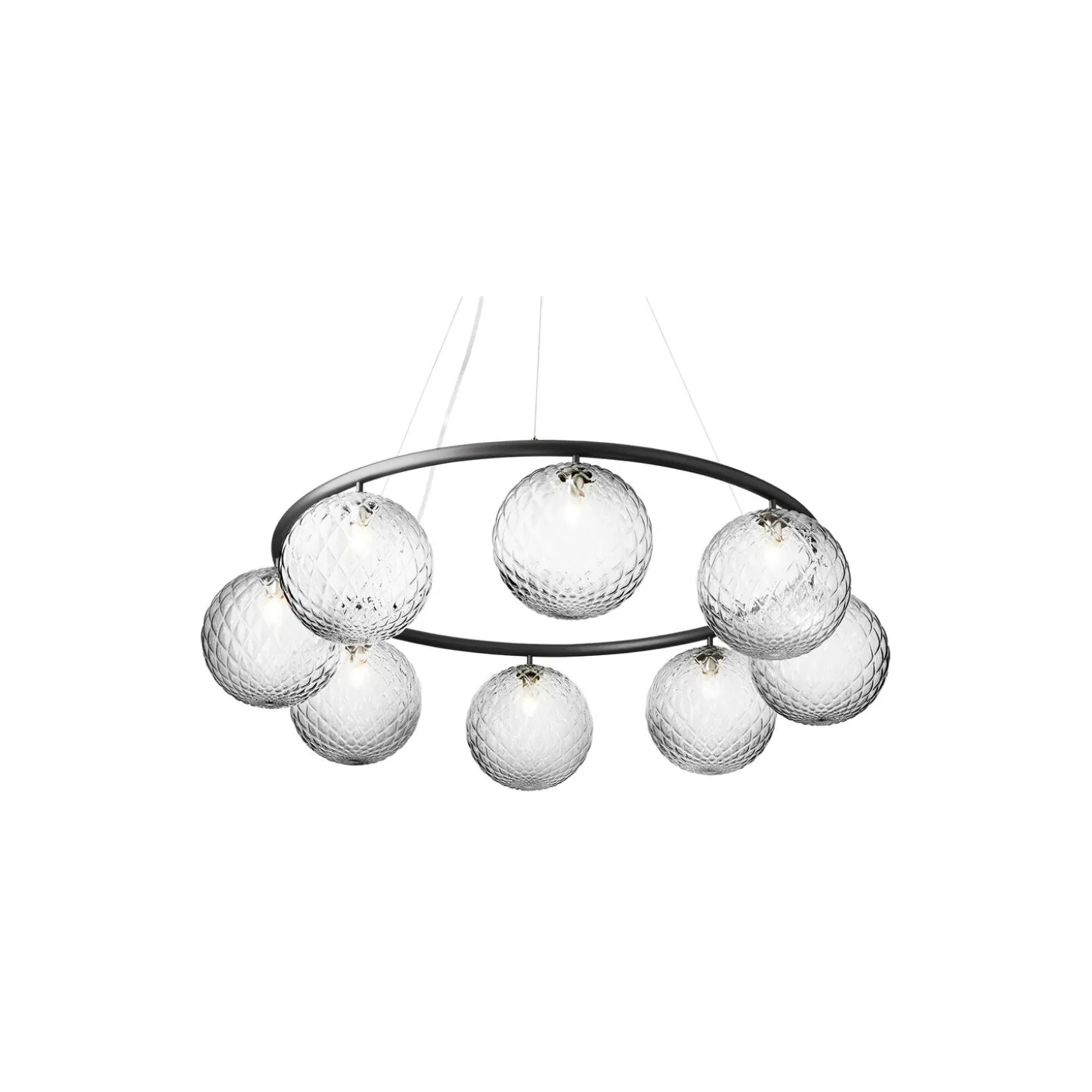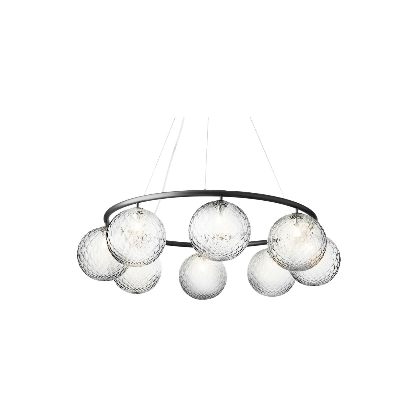 Miira 8 Circular har et klassisk udtryk og er designet til at hænge lavt eller højt fra loftet. Højden justeres nemt fra 20 til 250 cm via et specielt wiresystem. Miira-lysekronen består af en pulverlakeret metalring i en rock grey-farve, hvorfra mundblæste glaskupler i klart optisk glas spreder et sanseligt lys. Den enkle og klassiske formgivning gør lysekronen anvendelig i mange indretningssammenhænge. Miira 8 circular har en diameter på 100 cm og tager sig flot ud over det store spisebord eller som indbydende belysning i den rummelige hall.
