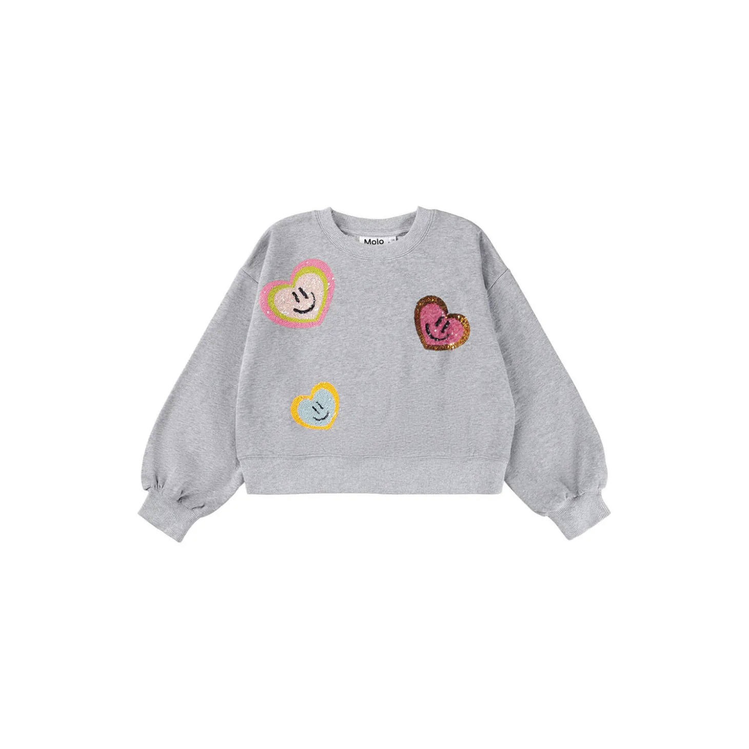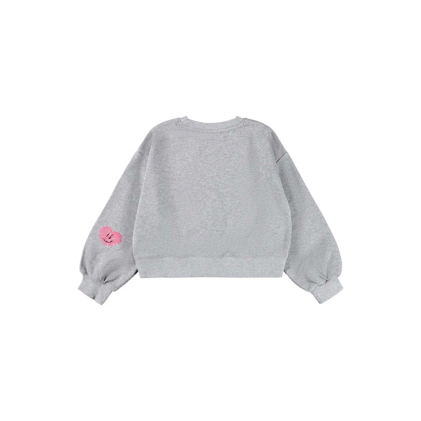 Lyslilla sweatshirt er lavet af økologisk bomuld og har et smukt blomsterbroderi og pailletter. Sweatshirten har en rund hals med ribkanter ved ærmer, hals og bund samt en løs pasform.