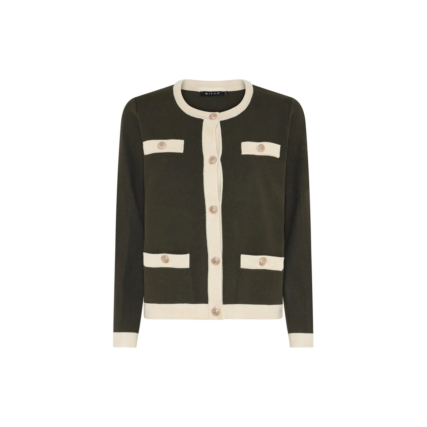 Cardigan med kontrastdetaljer, dekorative lommer og knaplukning. Et sofistikeret og klassisk design.