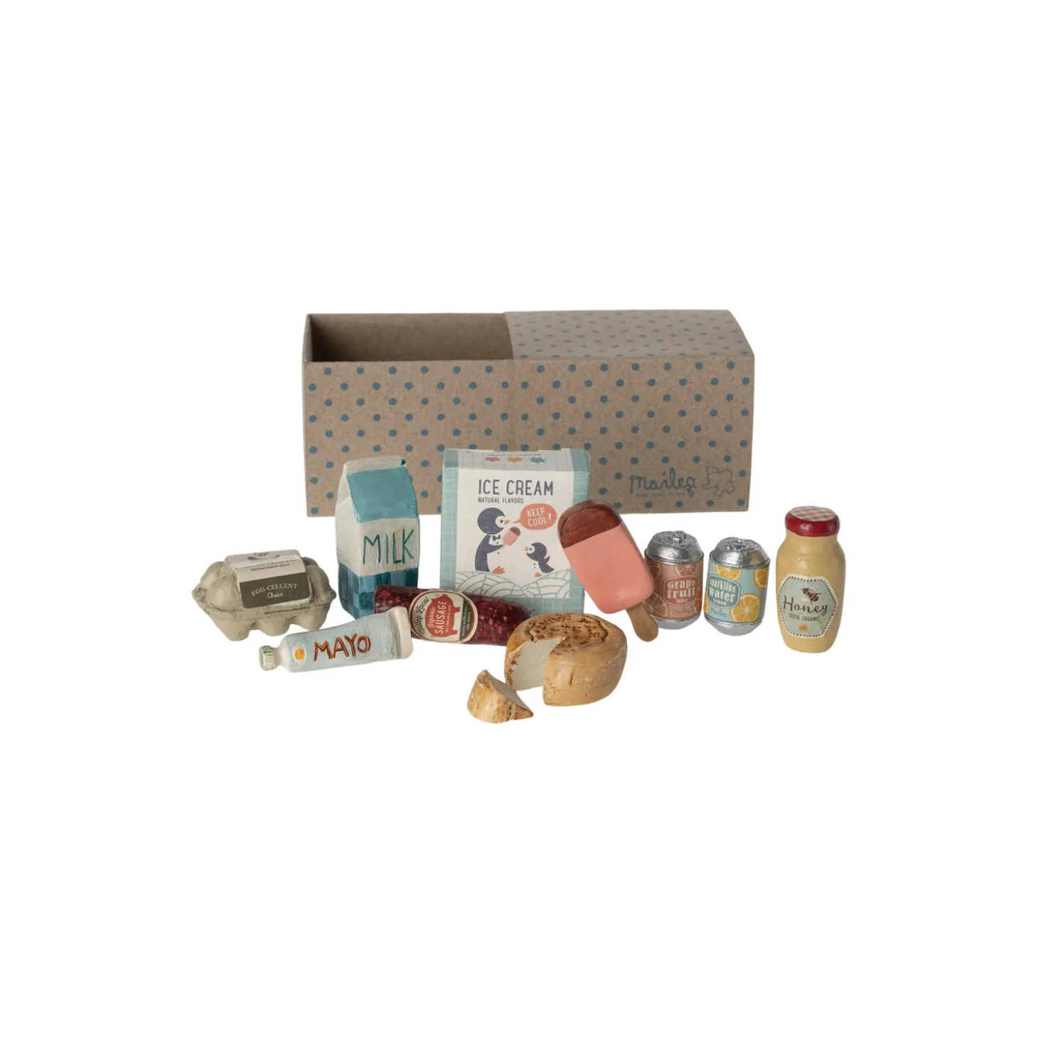 Alt mad som din Maileg ven behøver. Dette sæt inkluderer mayonnaise, mælk, honningkrukker, pølser, 4 ispinde, æggebakker, 2 sodavand og ost. Der kan forekomme små variationer i malingen.