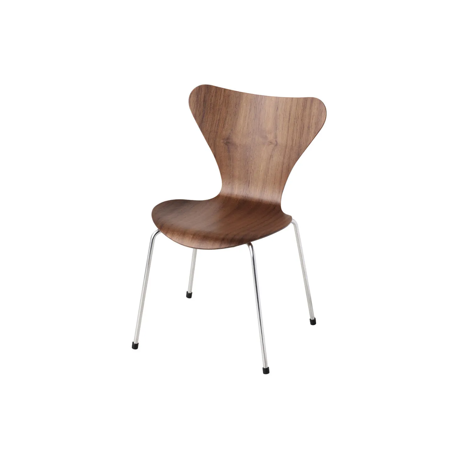 Miniature Serie 7™ stol i finér med stel i forkromet stål fra Fritz Hansen. Farve: valnød. Mål: 13×8,5 cm. Design: Arne Jacobsen.