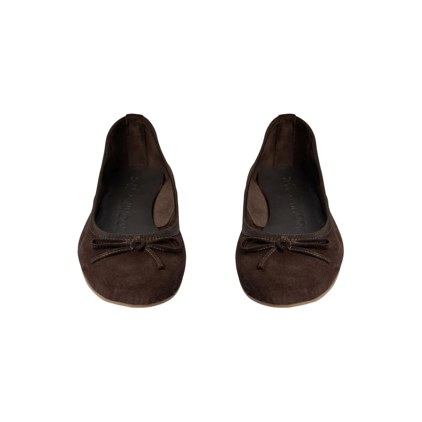 Sød ruskind ballerinasko i en smuk dark brown med sløjfe over vristen. Skoen er designet i 100% læder med gummisål.