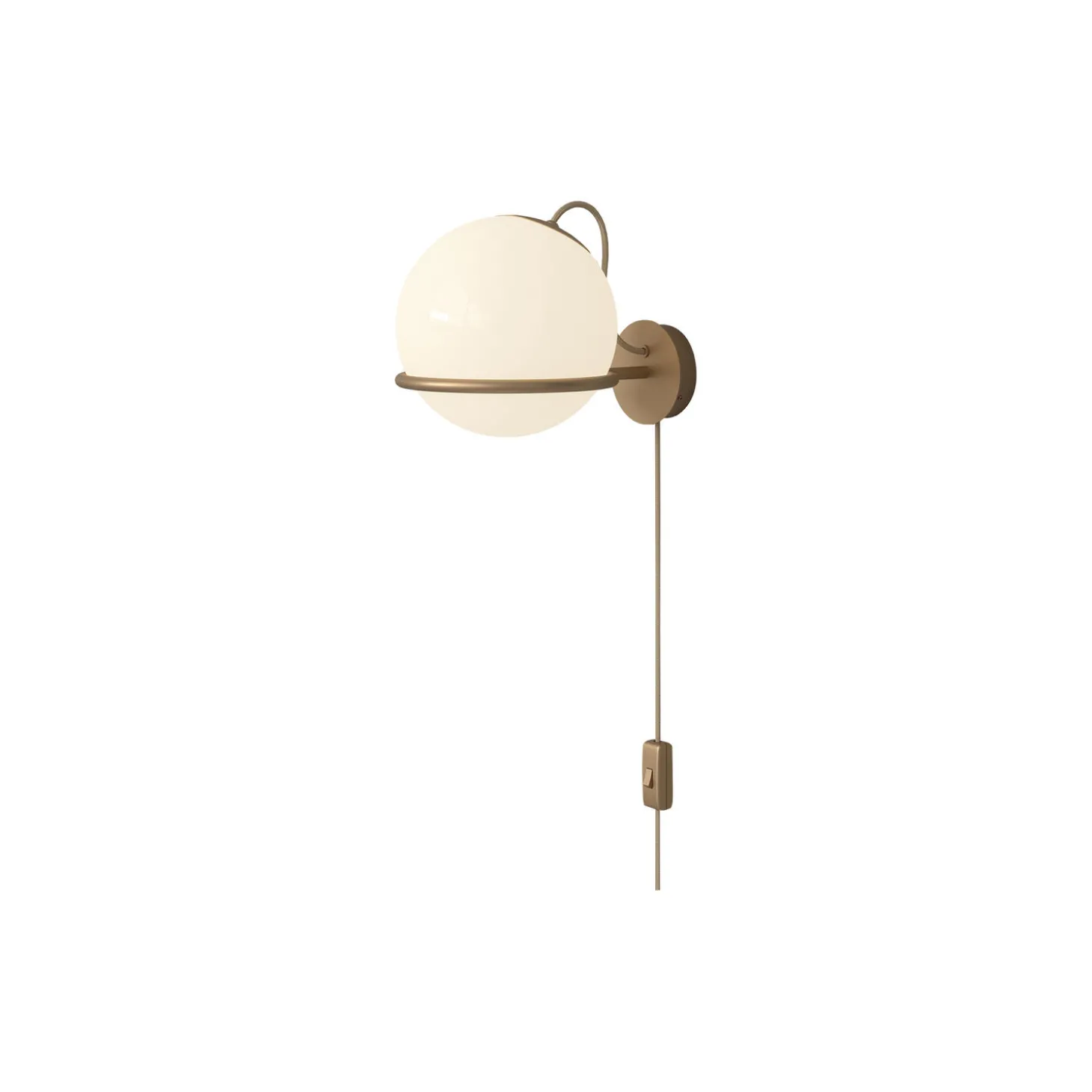 Model 238/1 Wall Lamp with Switch in opaline glass and steel from Astep. Colour: opaline/champagne. Dimensions: H: 21 x W: 20 x D: 30 cm. Light Source: 7W LED (max. 60W) E27. Design: Gino Sarfatti. Complimentary bulb included. Throughout his life, Gino Sarfatti was fascinated by the sky, and especially by the perfect light emanating from the moon. Le Sfere Collection is a testament to this special attraction of his. Conceived from 1959, it is a family of opaline glass lamps revolving around a single blown luminous sphere held in place by a painted. aluminium ring. A simple, yet elegant principle and a refined embrace that lends the luminaire a graphic expression to bring forth its distinctive aesthetic. The single blown opaline glass sphere is gently held by a Black or Champagne painted steel ring. The steel ring has a small cut, enabling the sphere to be placed facing downward or upward and thus providing a direct or indirect light composition. Model 237/1 features single 14cm diameter sphere, whereas the sphere of the model 238/1 is larger, measuring 20cm in diameter.