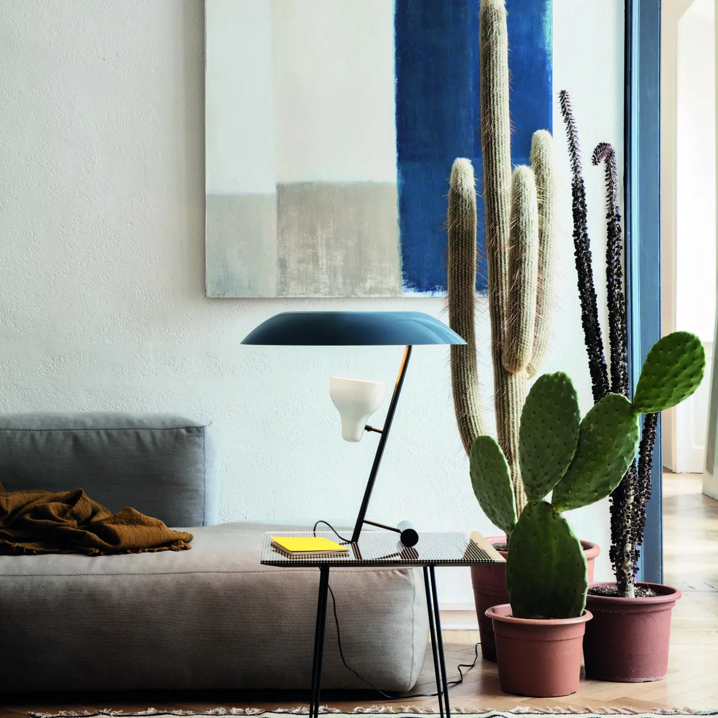 Model 548 Table Lamp in opaline methacrylate and dark burnished brass from Astep. Colour: grey/dark burnished brass. Dimensions: H: 50 x L: 50 x W: 50 cm. Light Source: built-in 7W LED. Design: Gino Sarfatti. Lighting conceived as a sophisticated game of screens, in perfect balance between direct and indirect light. Gino Sarfatti designed the Model 548 in 1951 giving vent to one of the themes that were most dear and congenial to him. For this table lamp, he used a spotlight that can be oriented towards a reflective screen formed by the large diffuser in methacrylate. The interaction between spotlight and screen defines a sophisticated effect, poised between lighting and perception. The spotlight in white painted aluminum is mounted on a tubular stem in polished or burnished brass, while a small brass bar at the base acts as a counterweight in the beautiful balancing of the individual elements. The re-edition is reparable, and the original incandescent bulb has been replaced by an LED source and an optical dimmer switch is discretely integrated into the original design.