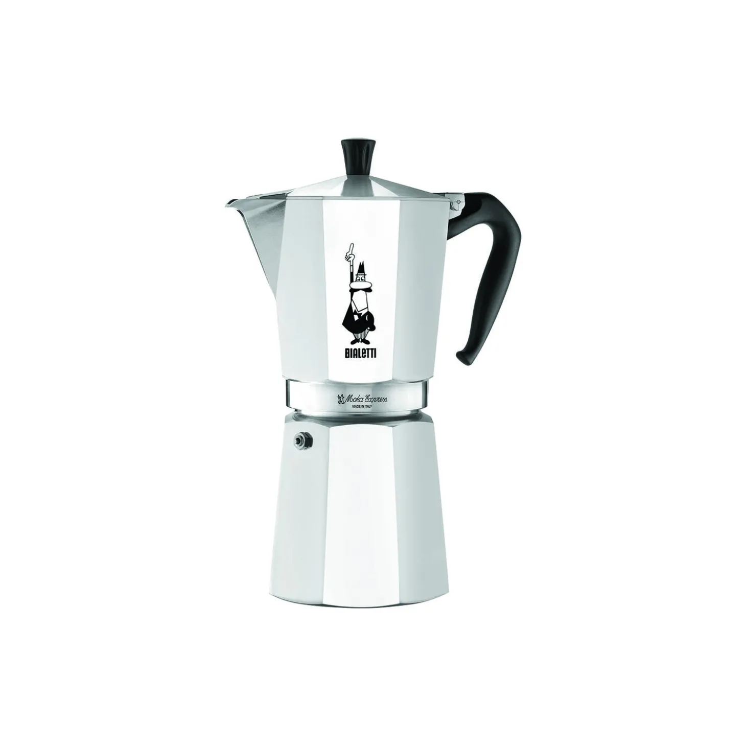 Moka Express espressokande i aluminium og termoplast fra Bialetti. Farve: aluminium. Indeholder: 0,77 L. 12 kopper. Ikke egnet til induktion.