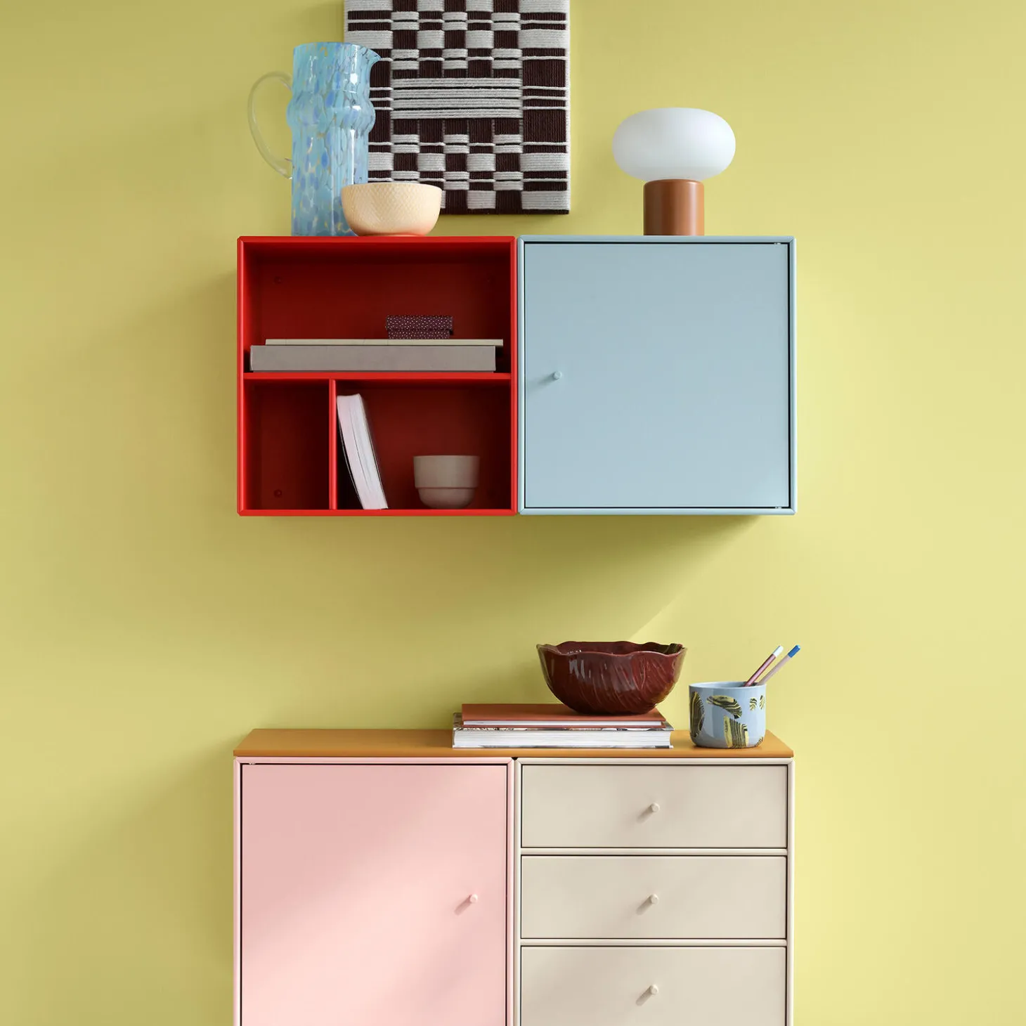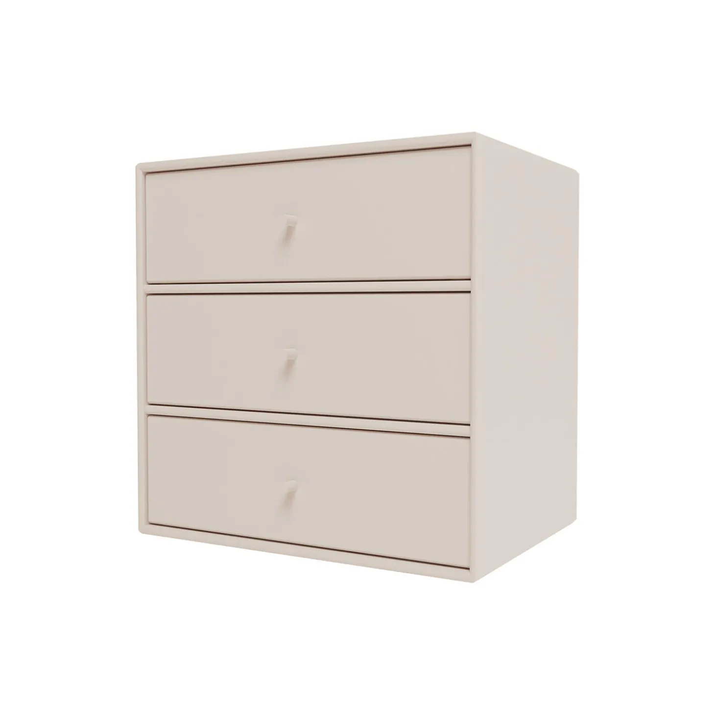 Dette Montana Mini modul kommer med tre hylder og tre skuffebakker. Skufferbakkerne hviler på hylderne og kan tages helt ud af modulet. Modulet kan dermed anvendes både med og uden skuffebakkerne. Skuffebakkerne er hvide og forsynet med en lakeret front i samme farve som modulets hylder og korpus.