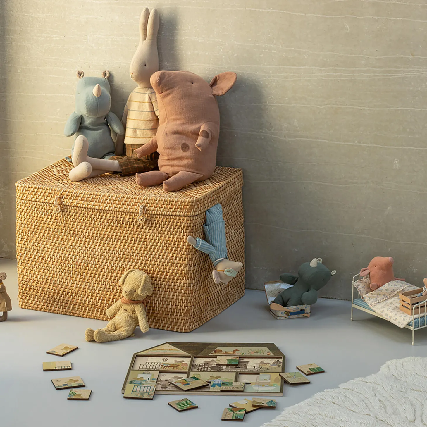 Træpuslespillet kommer med 31 brikker uden sammenlåsende mønstre. Illustrationerne er håndtegnede af Dorthe Mailil og viser 7 forskellige rum i Mouse hole Farmhouse. Puslespillet har desuden grafikken printet på basen.