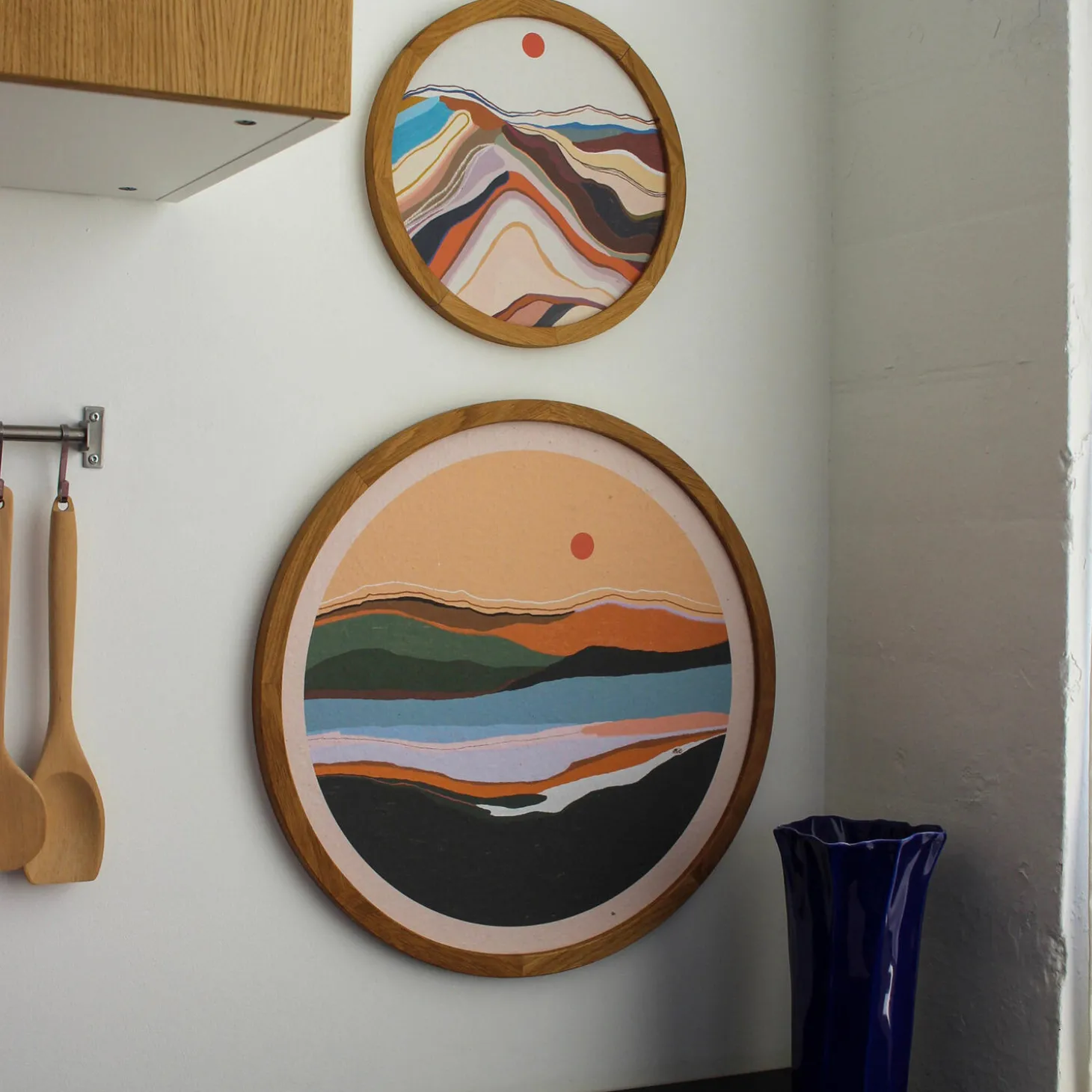 - Materiale: håndlavet cirkulært kunsttryk i egetræsramme