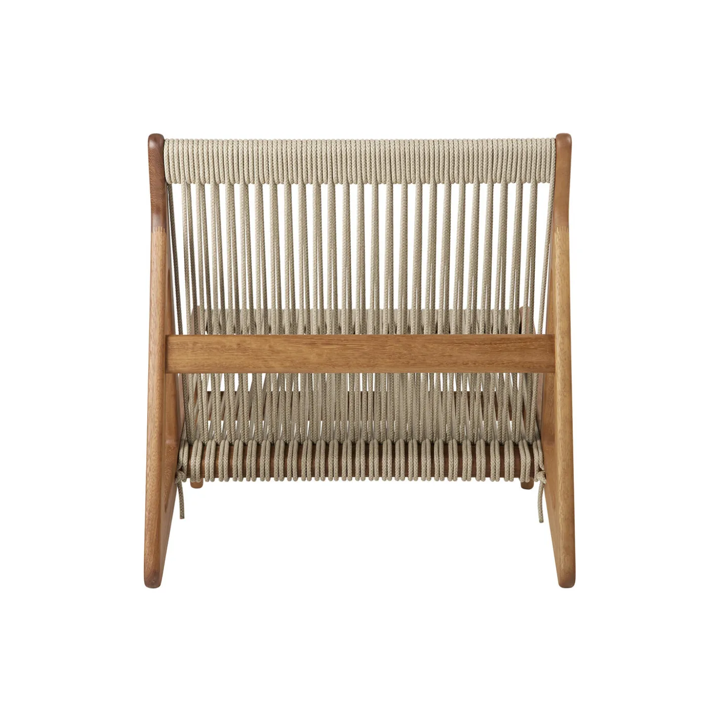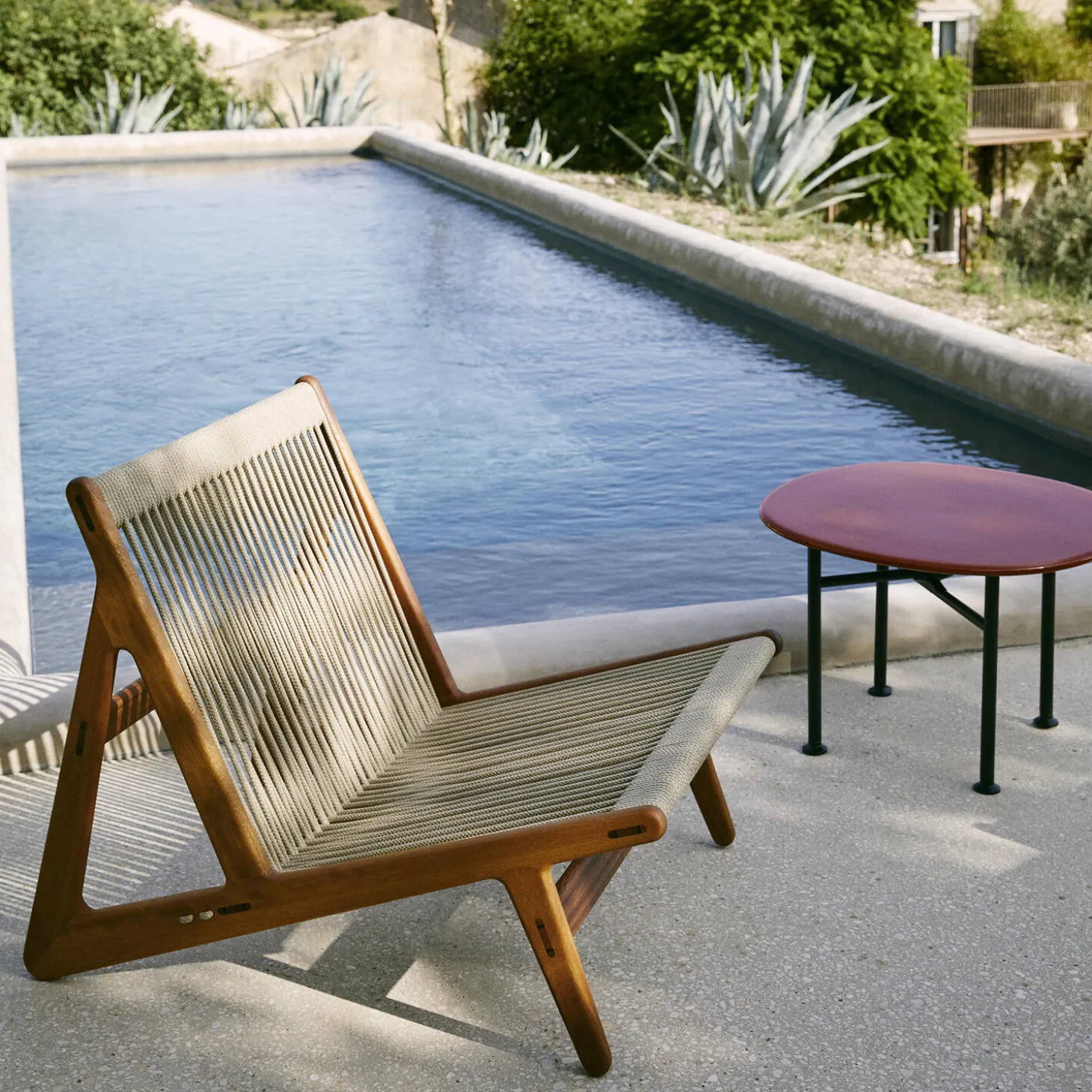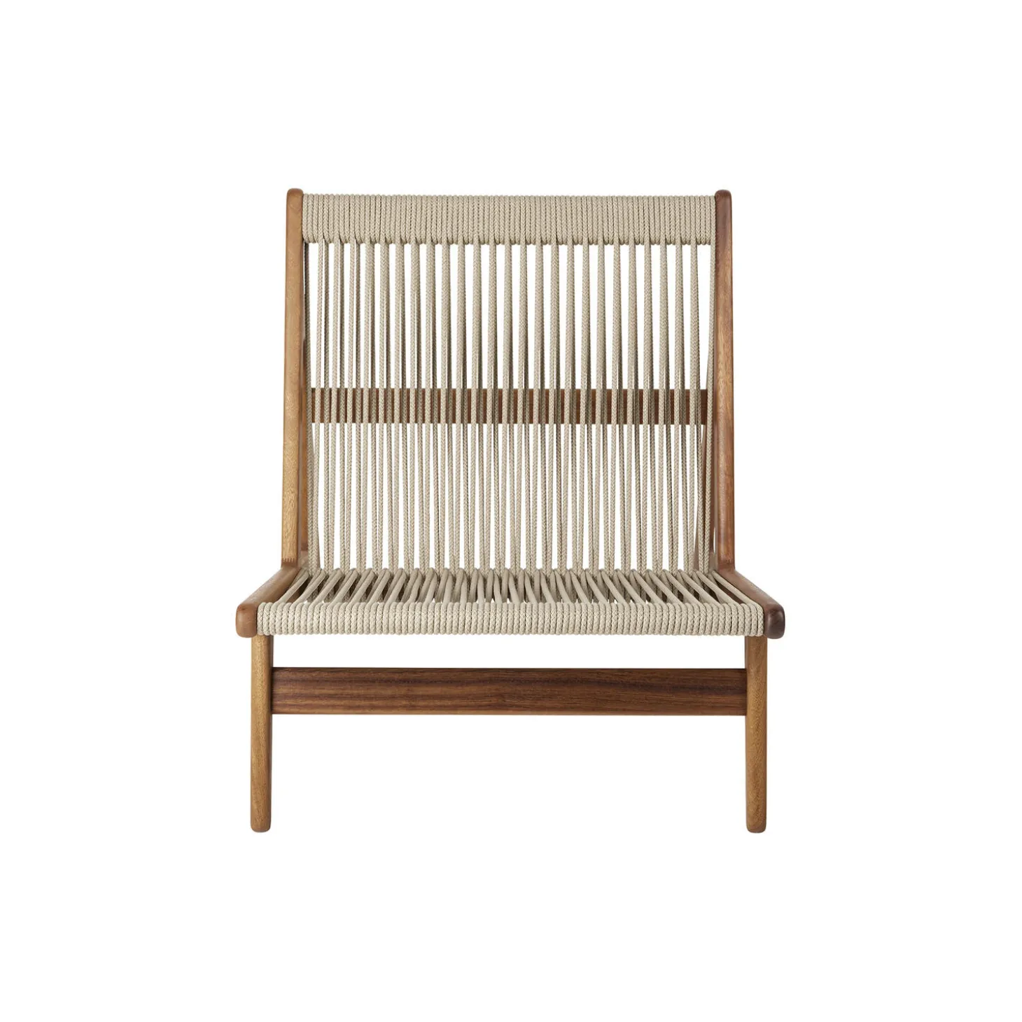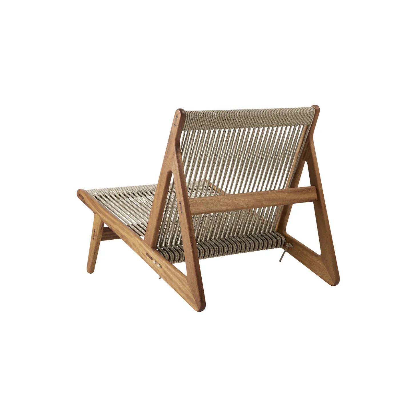 MR01 Outdoor Initial Lounge Chair i olieret iroko og syntetisk reb fra GUBI. Farve: oiled iroko/sunfire melange beige/sand. Mål: H: 69 x B: 65 x D: 88 cm. Siddehøjde: 33 cm. Design: Mathias Rasmussen.