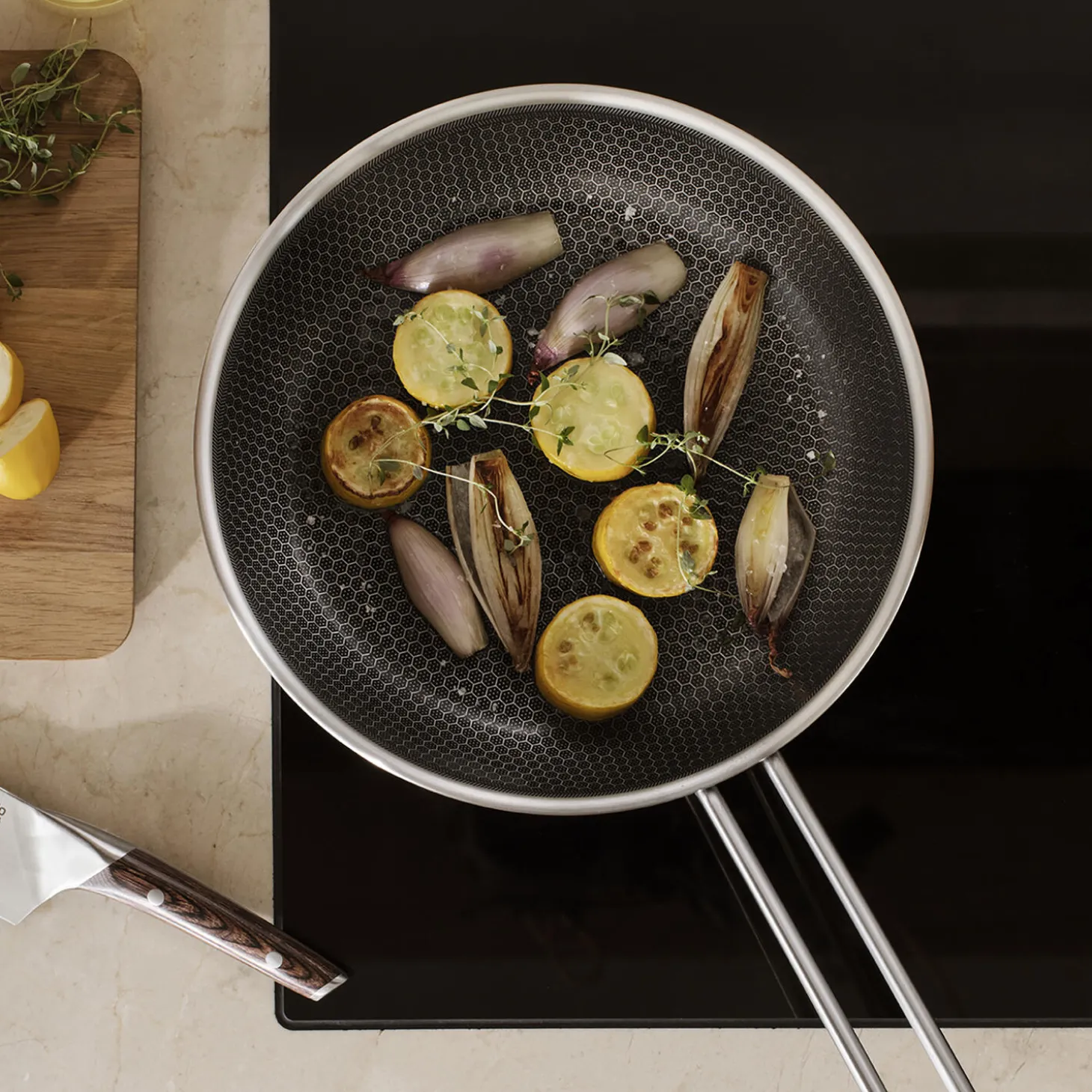 Uundværlig allround stegepande med banebrydende keramisk belægning, der gør panden hårdfør i særklasse. Pandens unikke mosaikmønster i overfladen består af rustfrit stål i toppen og keramisk Slip-let® belægning i bunden og tåler brug af metalredskaber. Belægningen gør det muligt at reducere mængden af fedtstof, giver den perfekte stegeskorpe og gør rengøringen nem. Stegepandens multi-layer 3 lags teknologi sikrer optimal varmefordeling og en hård yderside modstår slid og brug. Brug panden til alt fra spejlæg til hakke- og plantebøffer. Stegepanden tåler en tur i ovnen op til 400° C og er velegnet til alle varmekilder, også induktion. Tåler maskinopvask og rengøring med stålsvamp. Belægning er fri for fluorstoffer.