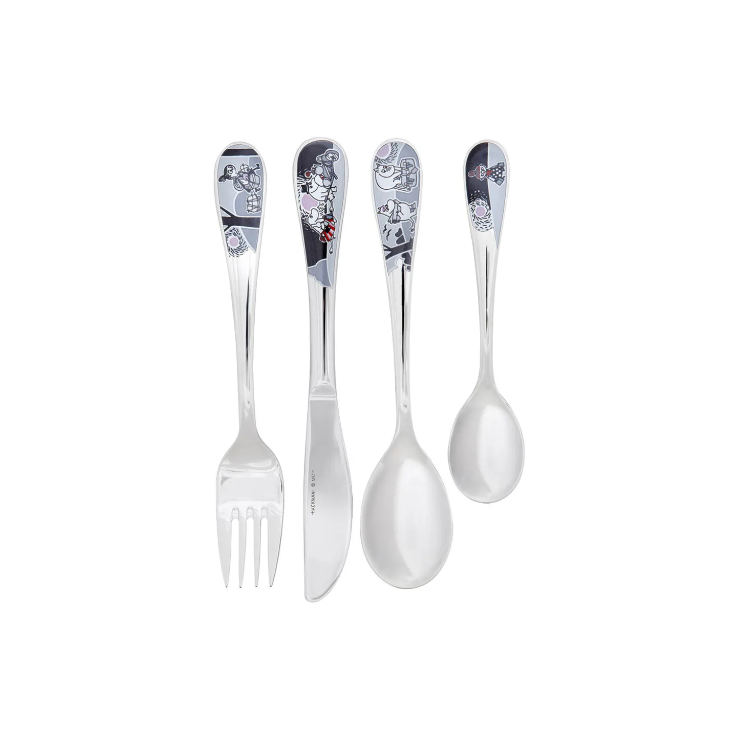 Mumi bestiksæt Mumi flytter i rustfrit stål fra Moomin Arabia. Farve: stål. Antal: 4 stk. Design: Tove Slotte.