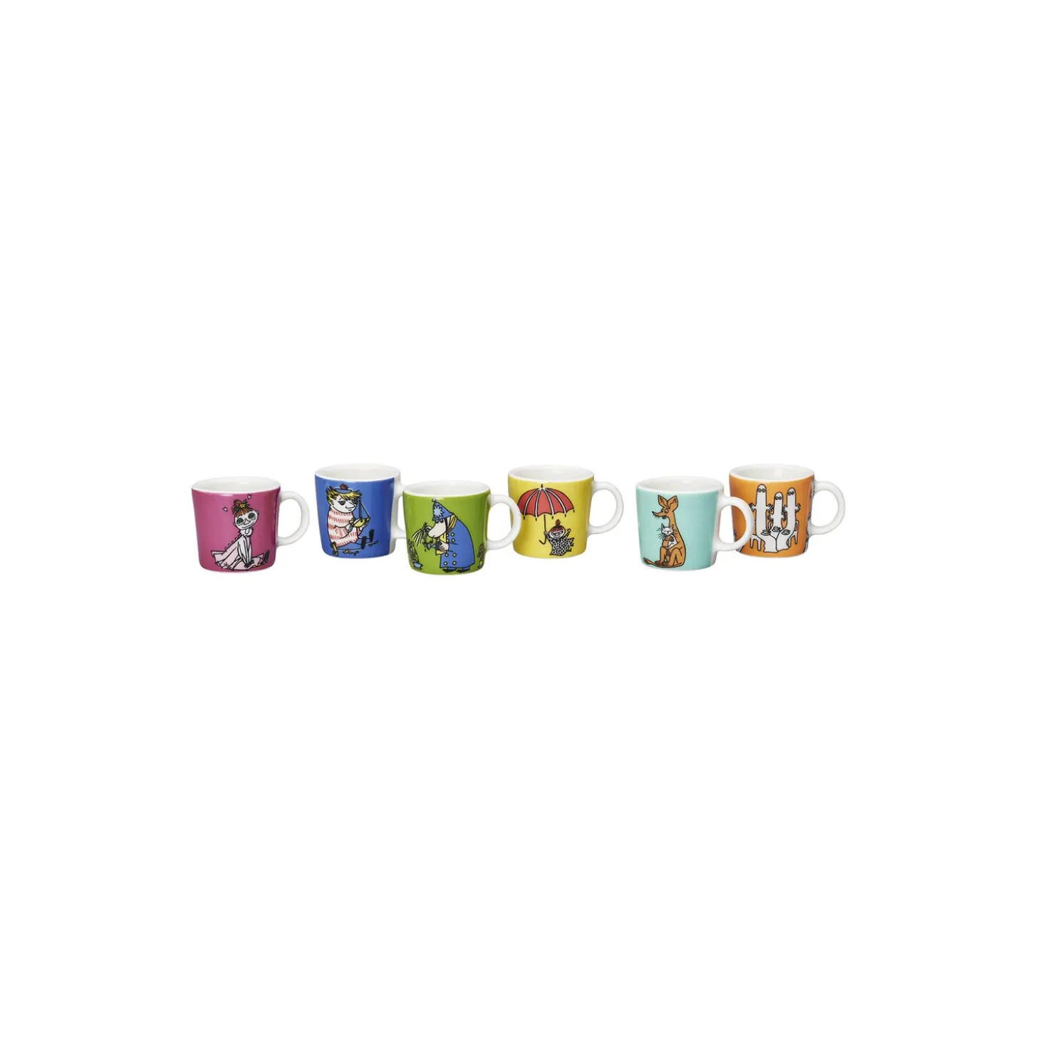 Moomin Minikrus i porcelæn fra Moomin Arabia. Farve: multifarvet. Antal: 6 stk. Design: Tove Slotte.