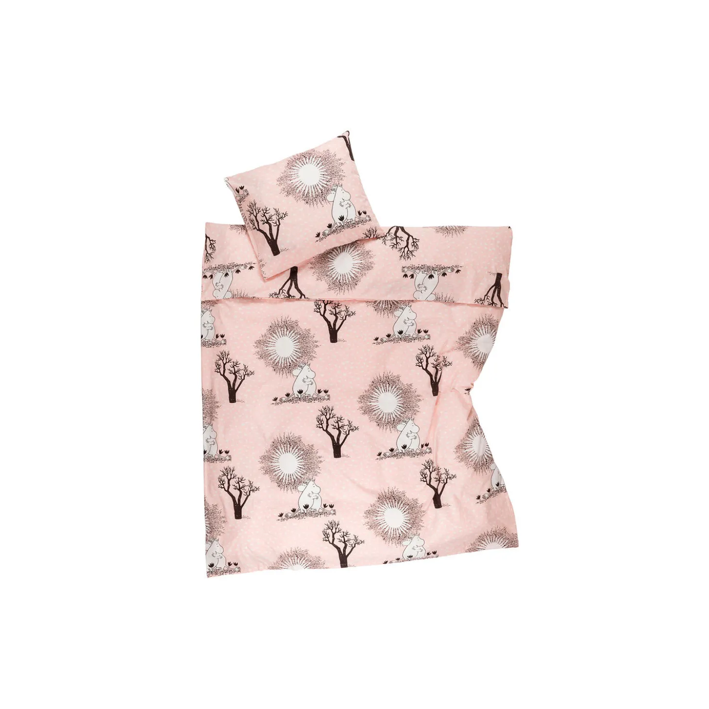 Falde i søvn omgivet af kærlighed. De to elskende, Snorkfrøken og Mumitrolden, krammer hinanden tæt efter endnu et af deres spændende eventyr. Den elskede illustration stammer fra Tove og Lars Janssons tegneserier og er nu også tilgængelig som sengesæt.