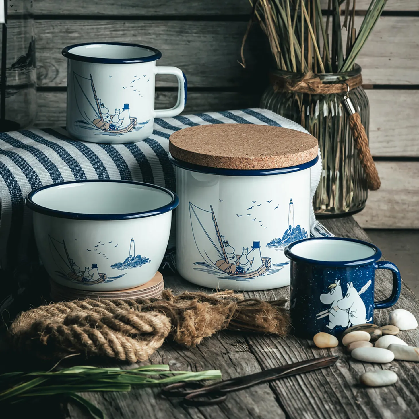Sømænd ohøj! Moomin Sailors er en kollektion med et maritimt hvidt og blåt farvetema krydret med nogle dejlige Mumi-detaljer. Tove Jansson elskede havet – og det er derfor, havet spiller en så vigtig rolle i hendes Mumi-historier og -illustrationer. Muurlas emaljestel består af en kerne af kulstofstål med et dobbelt lag emalje. Emaljeprodukterne er holdbare og lette, og de er perfekte til både indendørs og udendørs brug.