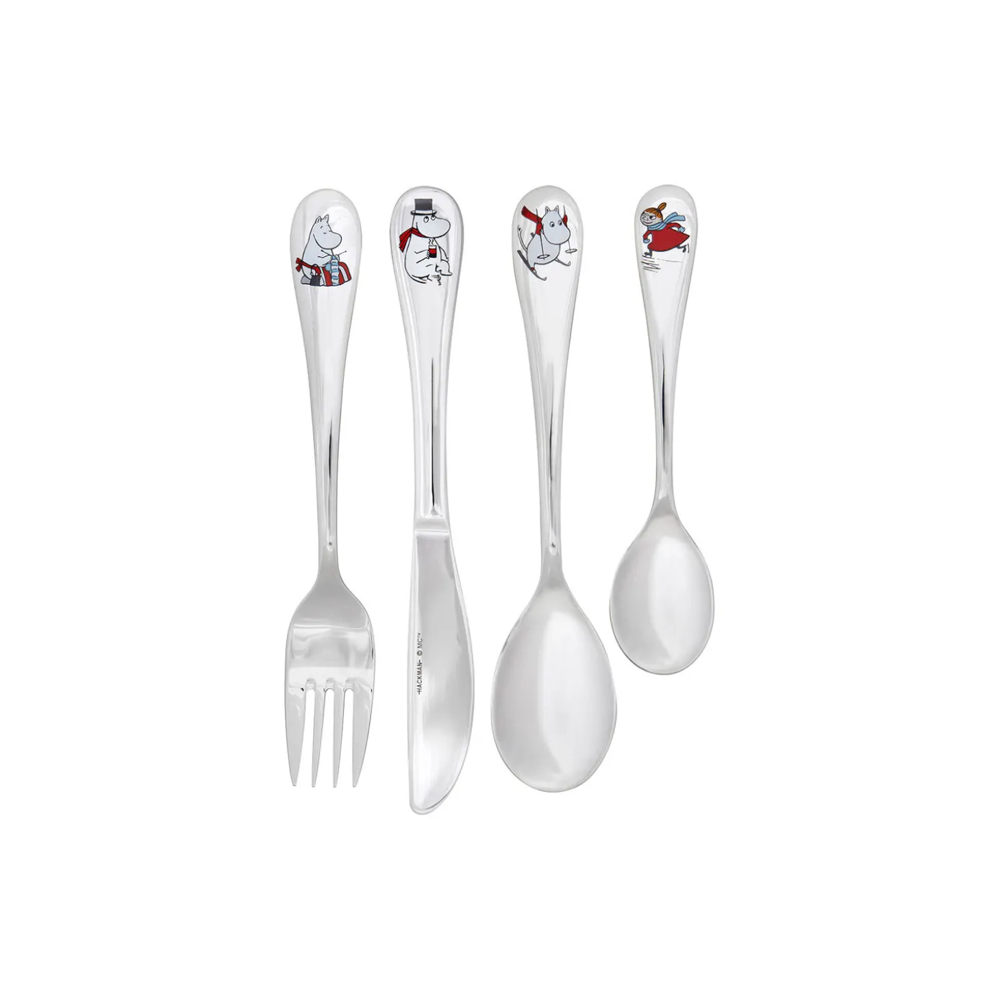 Mumi bestiksæt Mumi vinter i rustfrit stål fra Moomin Arabia. Farve: stål. Antal: 4 stk. Design: Tove Slotte.