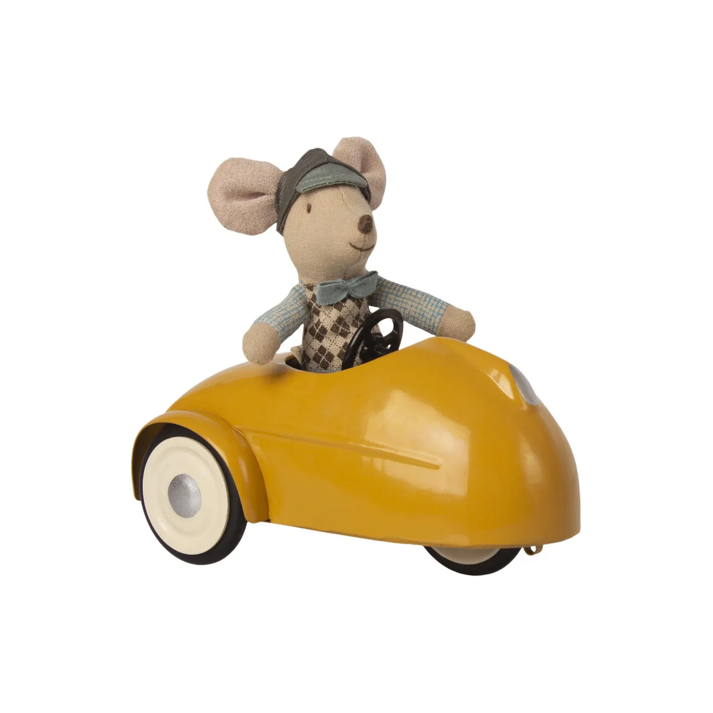 En flot vintage bil med chauffør og tilhørende garage. Metalbilen er malet i en autentisk lysgul farve og det bløde sæde har læderlook. Den flotte chauffør passer godt på bilen. God tur.