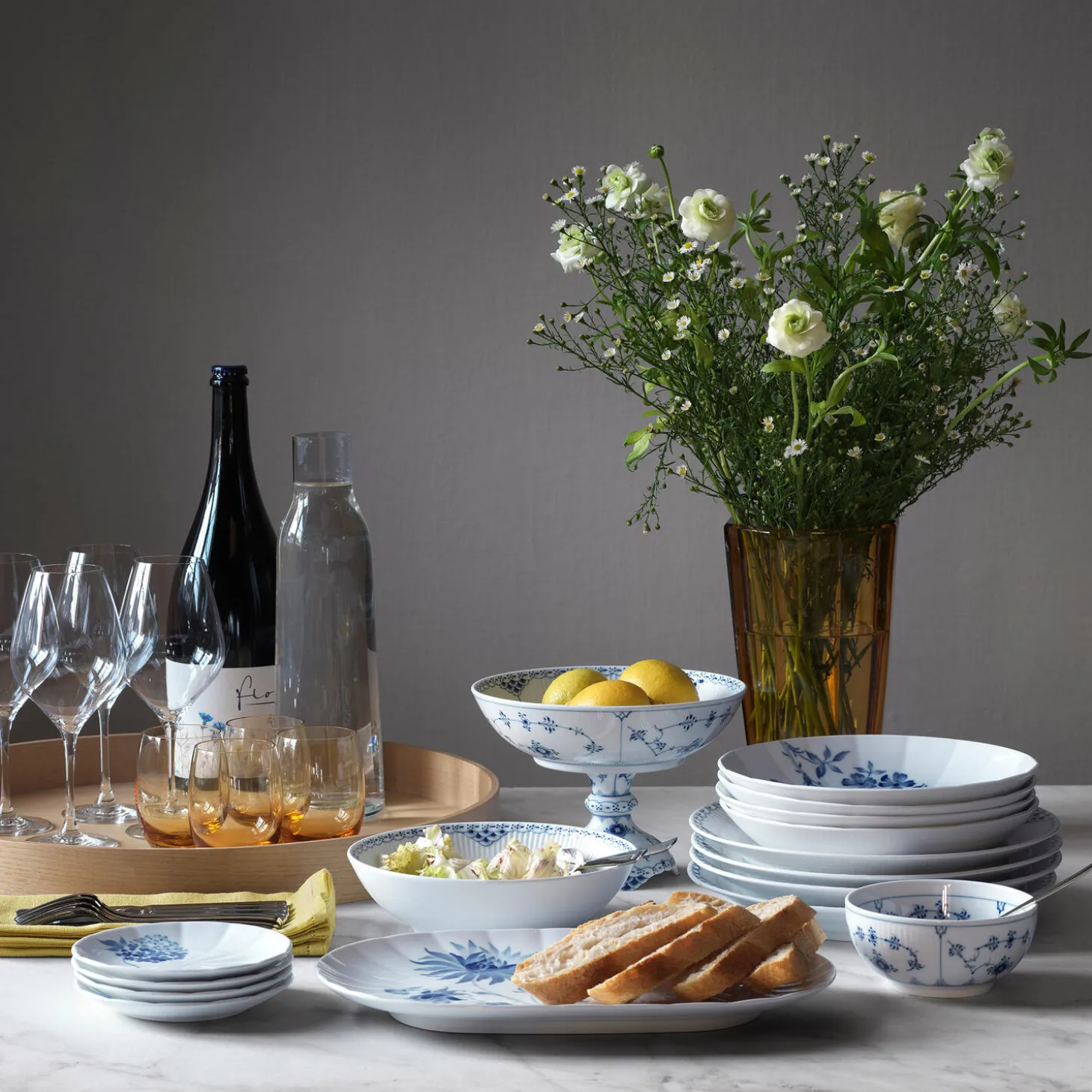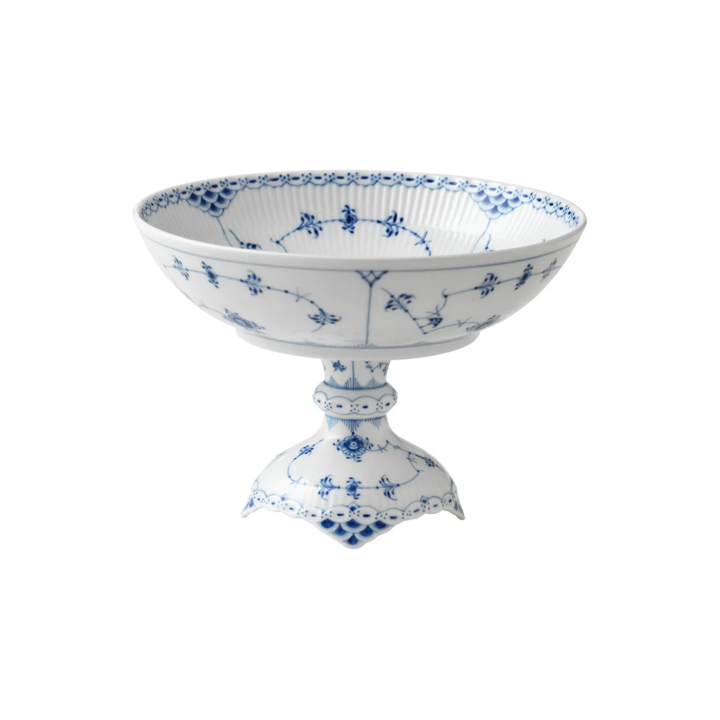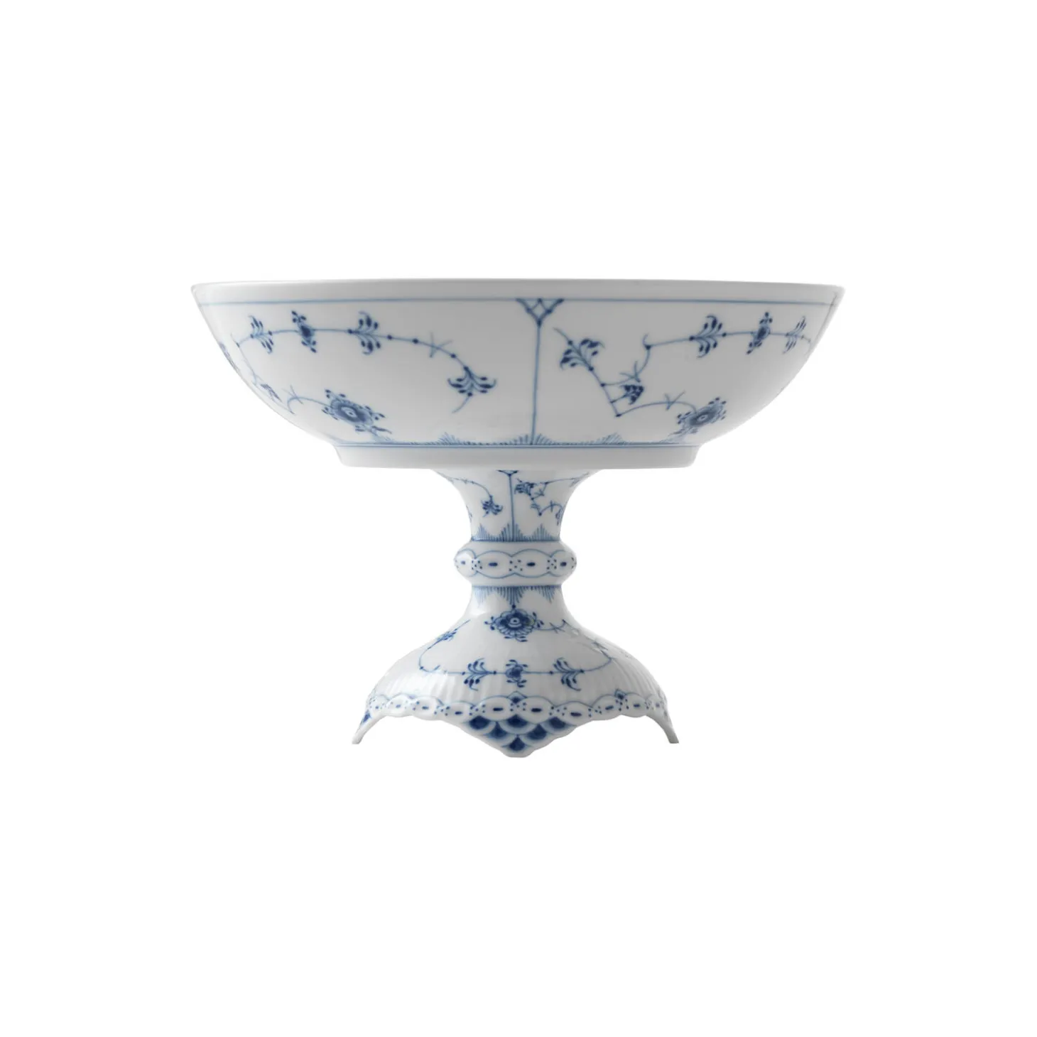 Musselmalet Halvblonde skål på fod i porcelæn fra Royal Copenhagen. Tilfør et strejf af klassisk elegance med denne håndmalede Musselmalet Halvblonde Skål på fod. Skålens fod løftes af delikate, blå fiskeskæl, som er en kærlig hilsen til formsproget på historiske musselmalede porcelænsdele, og hver en del på skålen er kærligt dekoreret i stellets tidløse, håndmalede mønster. Skålen med en højde på 15,5 cm er nyttig som en serveringsskål eller som frugtskål.