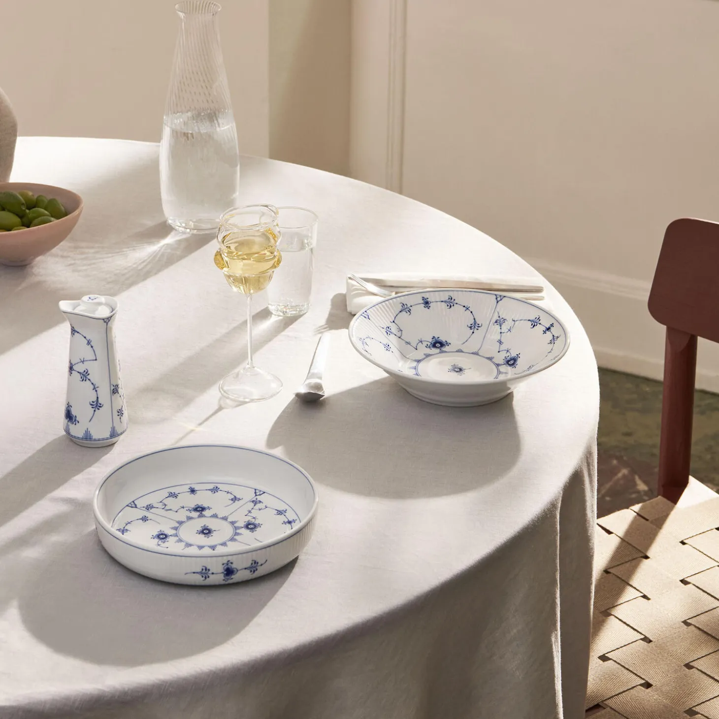 Som en tilføjelse til det eksisterende udvalg af dybe tallerkener i Musselmalet Riflet passer den dybe tallerken på 21 cm ind mellem den mindre og større version. Tallerkenen er oplagt at bruge til mindre, smagfulde serveringer eller snacks.