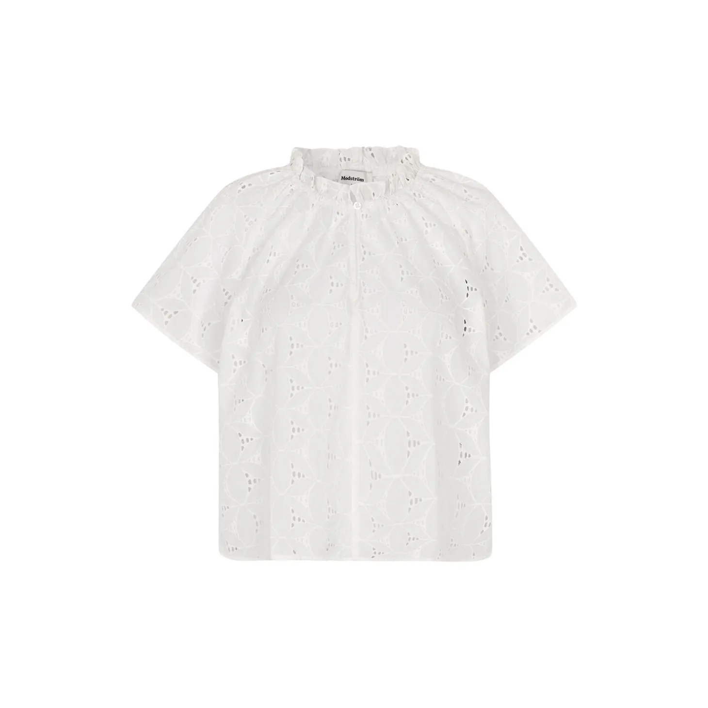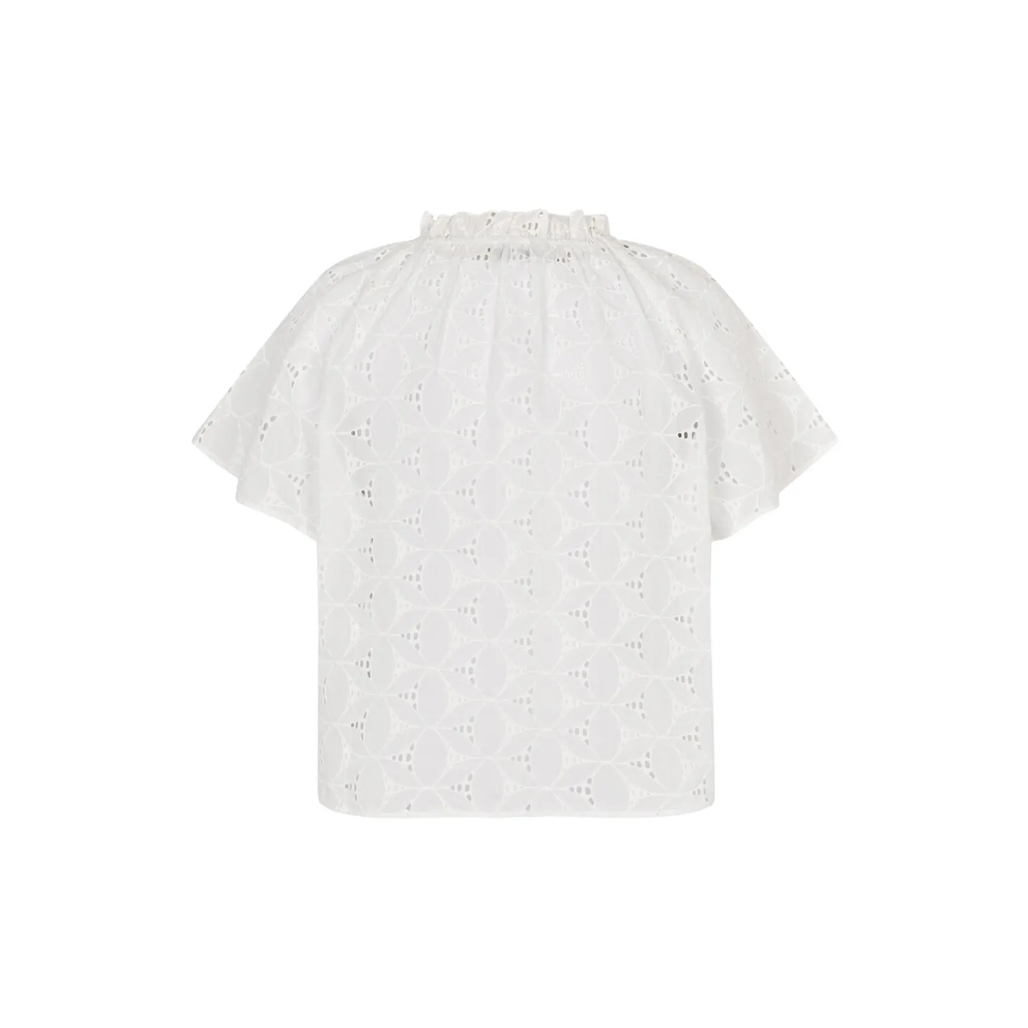 Kortærmet top i broderi anglaise. NanetteMD SS top har en løs pasform og en åbning fortil med knappelukning.
