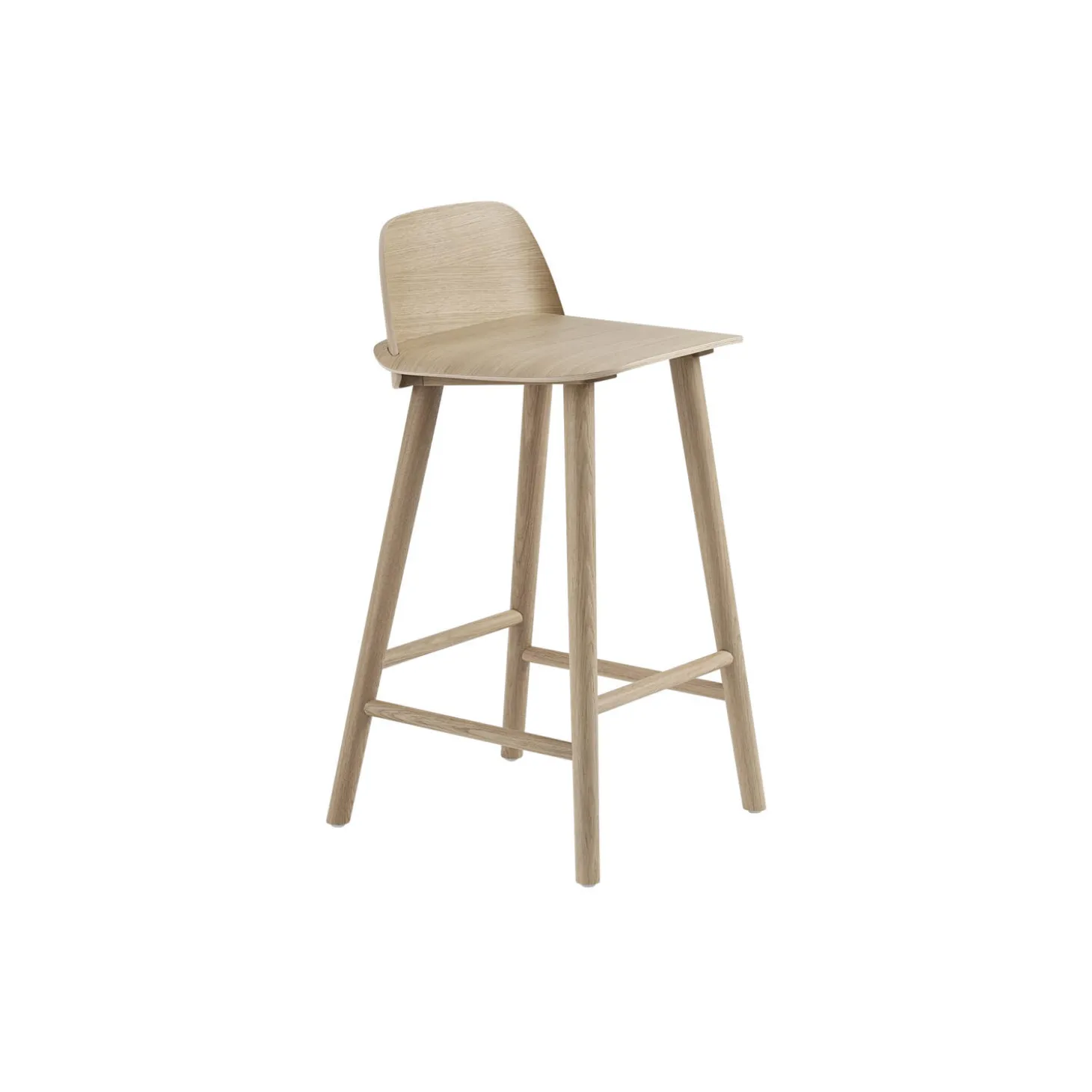 Nerd Counter Stool from Muuto. The Nerd Counter Stool is designed with a playfully contemporary expression, joined by its wooden Scandinavian materiality. The seamless integration of its back and seat makes for a characterful detail alongside the curved edges of its seat.