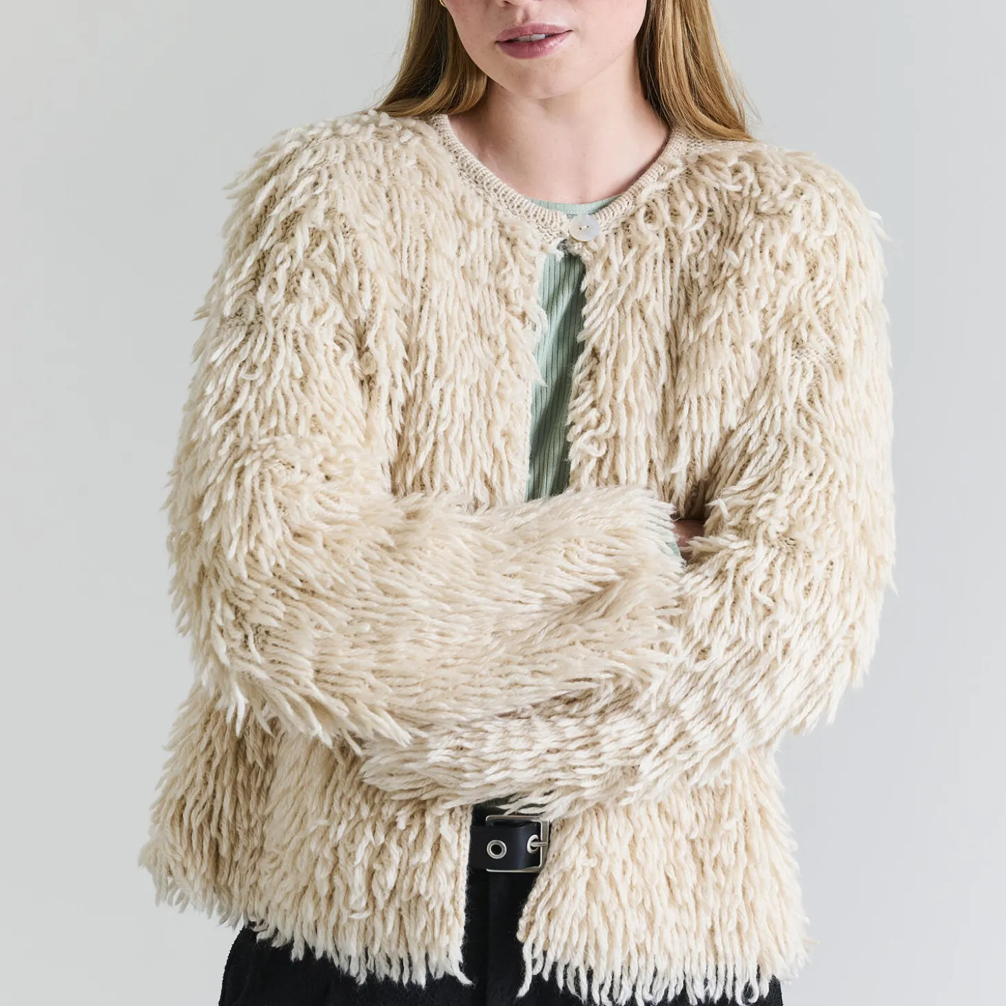 En cardigan fortolket på en ny og virkelig cool måde. Den har fluffy frynser og lukkes med en enkelt knap i halsen. Brug cardiganen til at opgradere alt fra herrebukser til kjole og nederdel. En virkelig lækker og stilsikker måde at holde sig varm på.