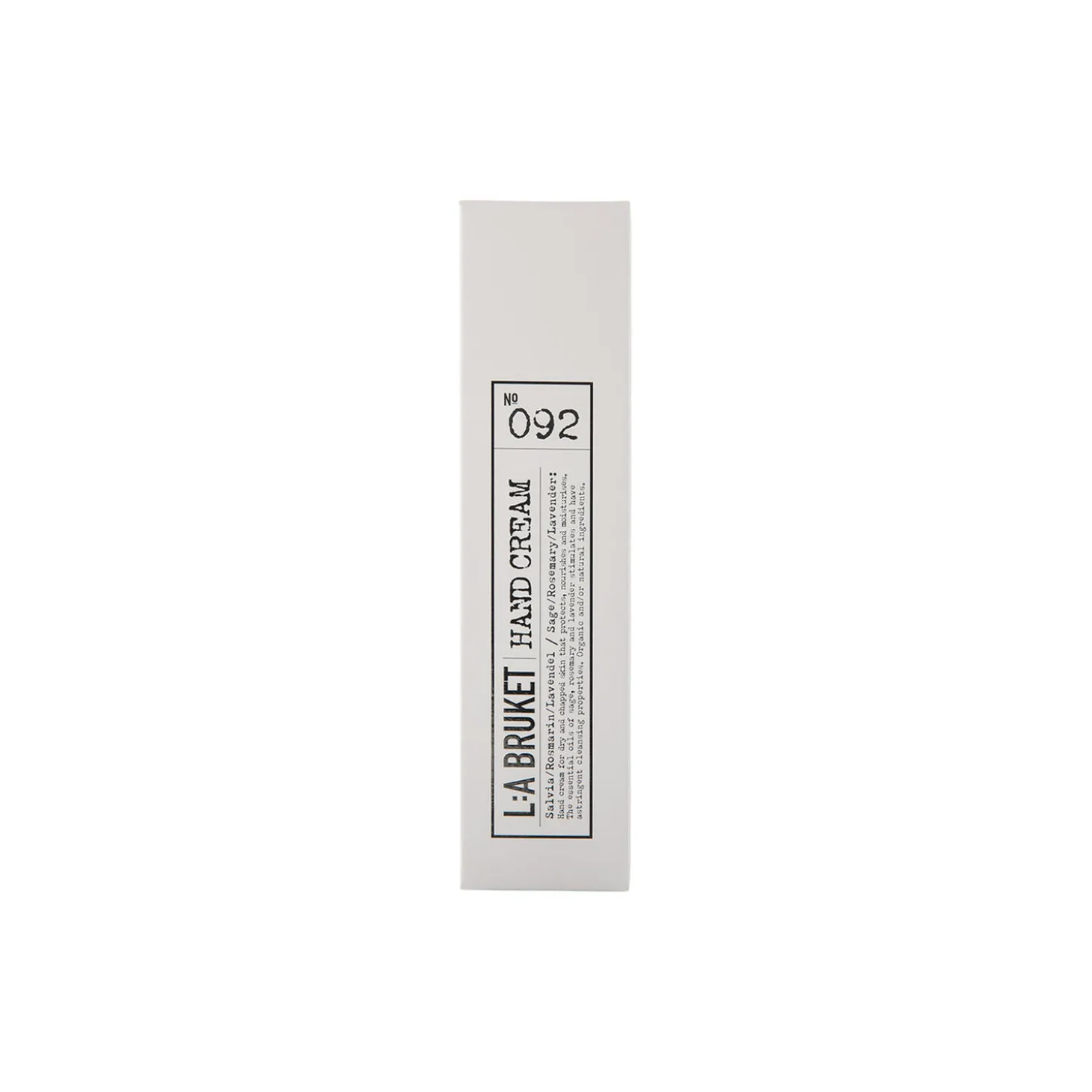 No. 092 Hand Cream fra L:a Bruket. Plejeanvisning: Opbevares på et køligt, tørt sted væk fra direkte sollys; Kun til ekstern brug. Sikkerhedsinstruktioner: Afbryd brugen, hvis der opstår irritation. Genbrugsinstruktioner: Placer aluminiumsrøret, plastikhætten og kartonkassen i genbrugsbeholderen. Sørg for, at røret er tomt før genbrug. Følg dine lokale retningslinjer for genbrug for korrekt sortering.