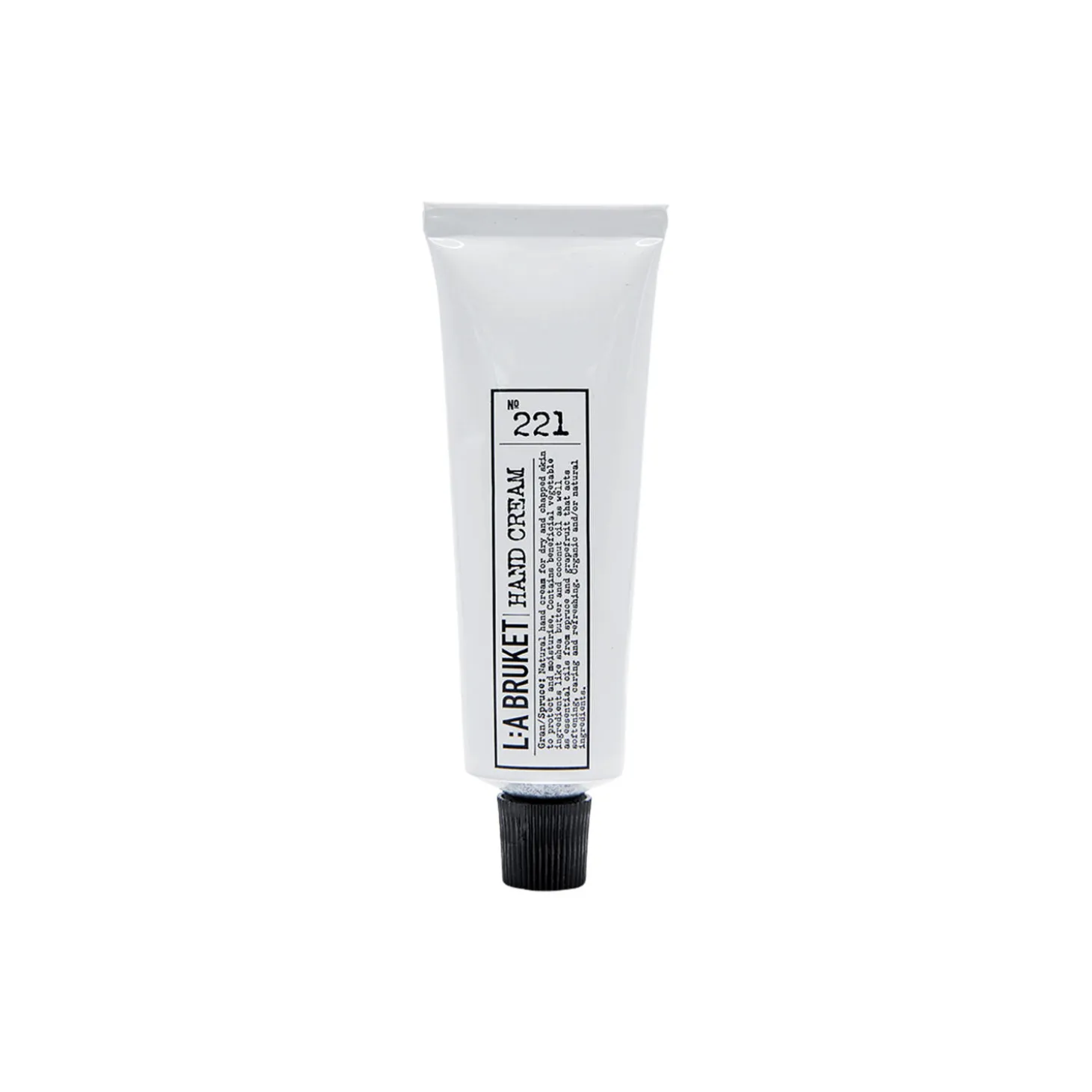 No. 221 Hand Creme fra L:a Bruket. Plejeanvisning: Opbevares på et køligt, tørt sted væk fra direkte sollys; Kun til ekstern brug. Sikkerhedsinstruktioner: Afbryd brugen, hvis der opstår irritation. Genbrugsinstruktioner: Placer aluminiumsrøret, plastikhætten og kartonkassen i genbrugsbeholderen. Sørg for, at røret er tomt før genbrug. Følg dine lokale retningslinjer for genbrug for korrekt sortering.