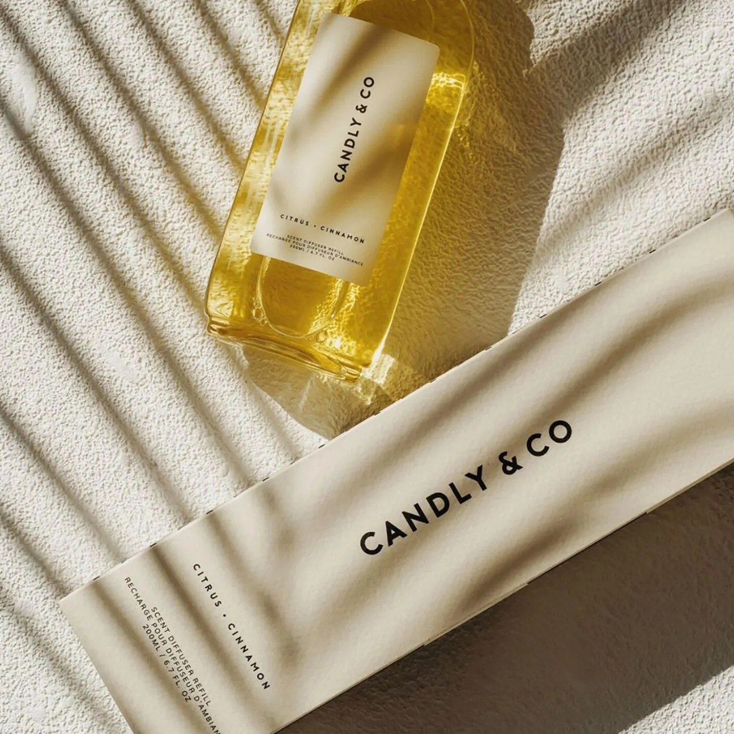 Candly&Co. duftdiffusor – håndlavet med omhu for dig og vores planet – økologiske & >90 % naturlige parfumer, veganske, grusomhedsfri. Duftene, der er specielt fremstillet til Candly, stammer fra Grasse – parfumeverdenens mekka. En smuk duft vil fylde rummet i over 4 måneder. Intensiteten af diffuseren kan justeres: Brug af 3-4 pinde vil skabe en subtil intensitet, mens brug af alle 8 pinde vil give en fuld duftoplevelse. Der er ingen grund til at vende pindene om for at opnå maksimal intensitet. Sættet indeholder en korkprop, der giver mulighed for gentagen åbning og lukning af parfumebeholderen.Topnoter: Frisk citrus, krydret kanelHjertenoter: Blomsterrig, sød vaniljeBundnoter: Cedertræ, AmberIndhold: parfume af høj kvalitet, duftolierKapacitet: 200 mlHåndlavet i Polen