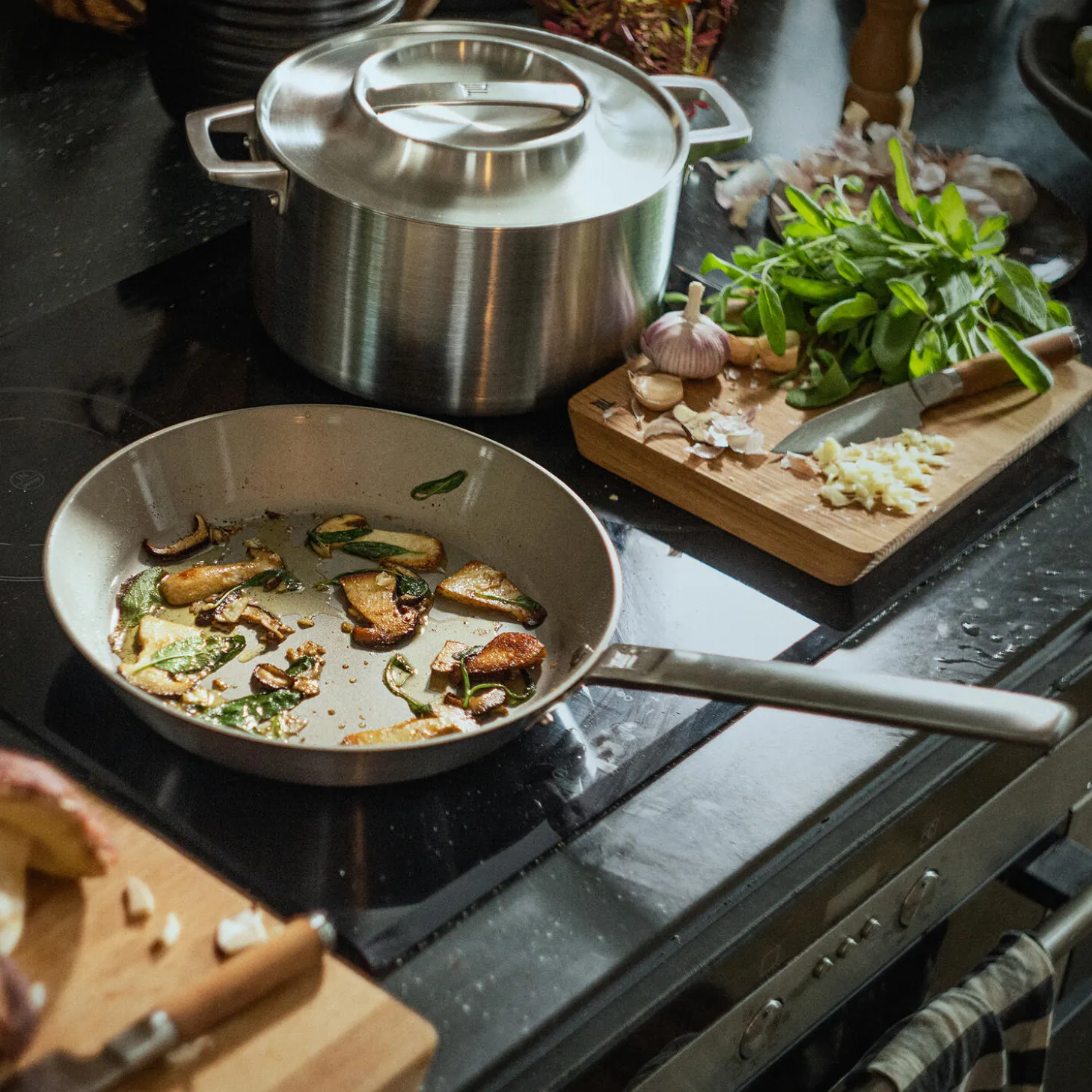 Fiskars Norden kogegrej i stål af højeste kvalitet udspringer af mange års håndværksmæssige traditioner med dybe rødder i den nordiske muld og er et godt eksempel på langtidsholdbart nordisk design, inspireret af naturen. Norden stegepande i stål (28 cm) har en tyk bund og en 3-lagskonstruktion fra kant til kant, der sikrer en jævn varmefordeling og gør panden særdeles velegnet til stegning og bruning af kød og andre madvarer. Aluminiumskernen mellem de ydre og indre lag af rustfrit stål sikrer jævn og effektiv varmefordeling på alle kogezoner. En non-stick Ceratec™-belægning med Thermium™-mineralbehandling giver panden enestående non-stick egenskaber, selv ved høje temperaturer, uden at gå på kompromis med det smukke ståldesign. Det gør kogegrej fra Norden serien perfekt til at tilberede selv de mest sarte ingredienser og frembringe de skønneste smage i dine retter. Det markante håndtag i rustfrit stål minimerer overførslen af varme. Maks. stege- og ovntemperatur helt op til 270°C. Fremstillet i Finland.
