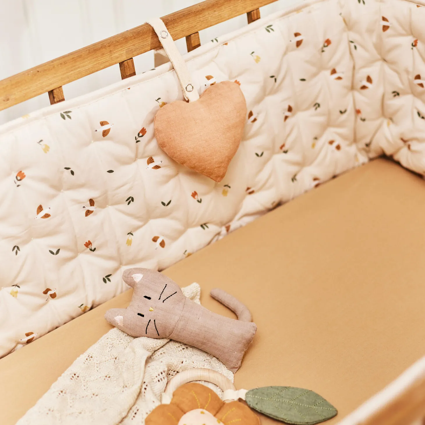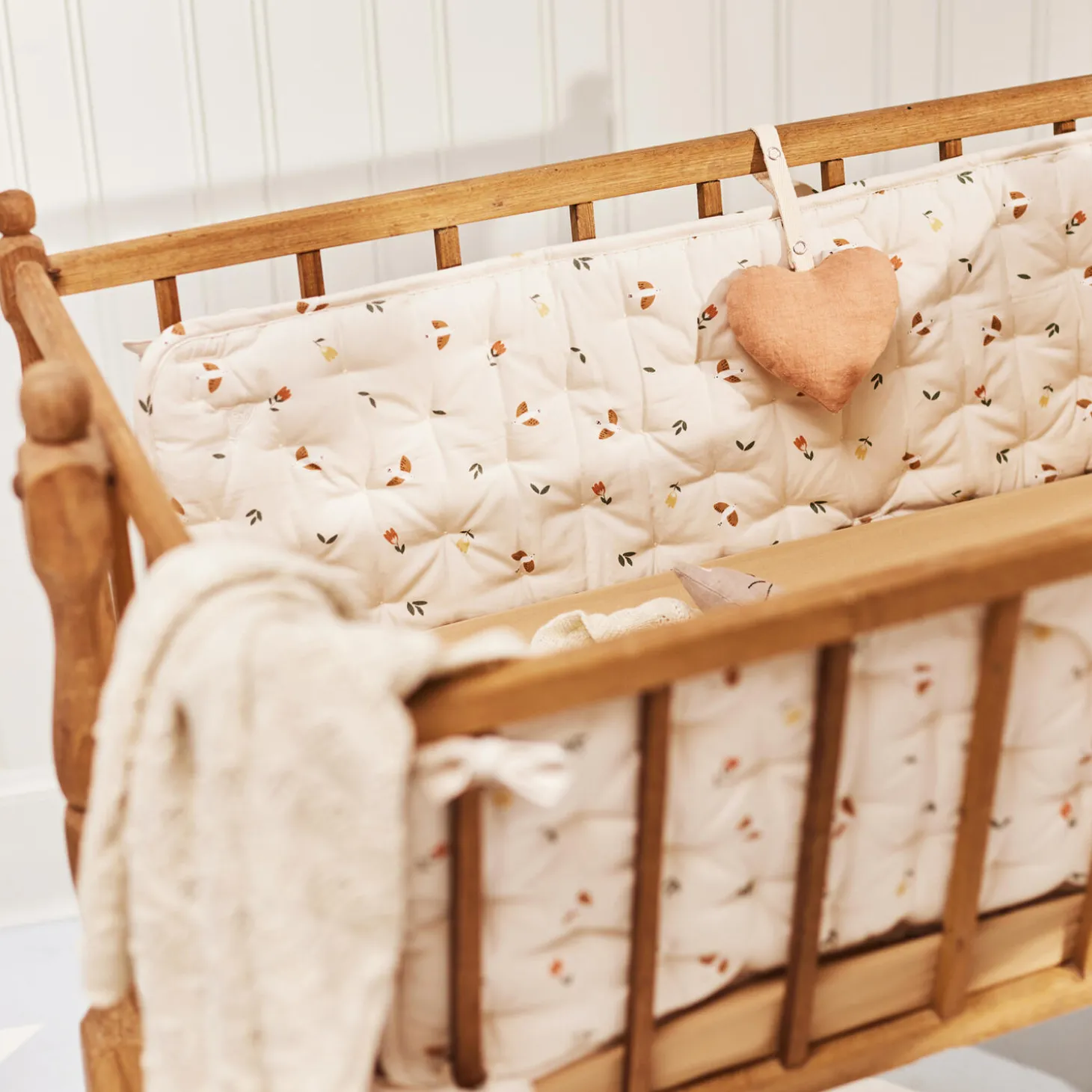 Blød sengerand i skønt quiltet look med fine bindebånd, som bruges til at fastgøre til sengen. Sengeranden er ca. halvt så lang som en tremmeseng for at sikre ventilation og samtidig give et blødt og hyggeligt sovemiljø.