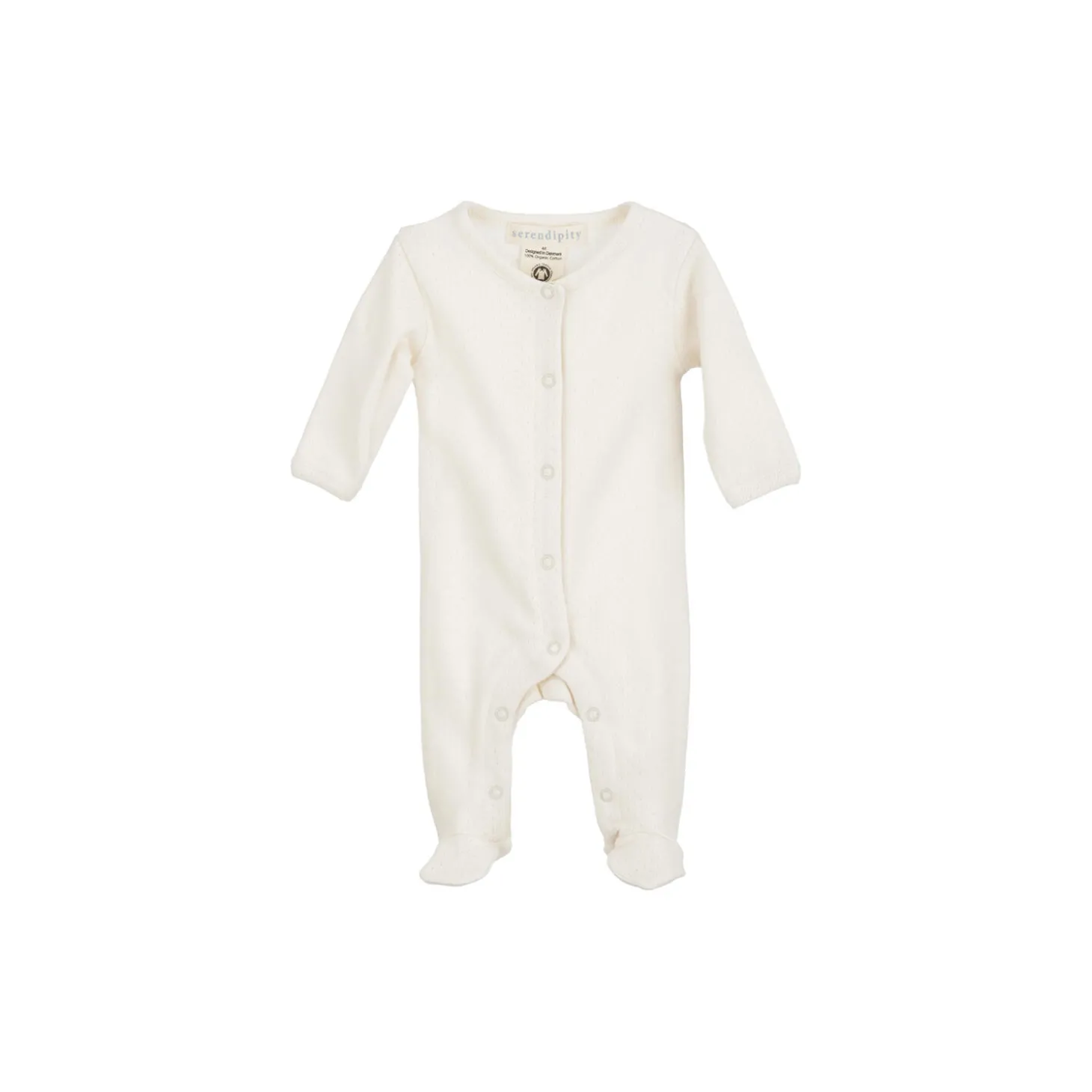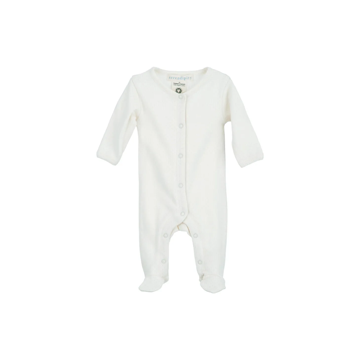 Heldragt til nyfødte i blød rib i cremefarvet rib med hulmønster. Fuld åbning foran og i ben så af- og påklædning er let. Åbnes med trykknapper. 100% blød økologisk bomuld og GOTS certificeret.
