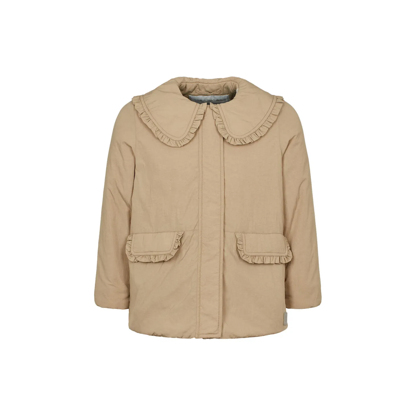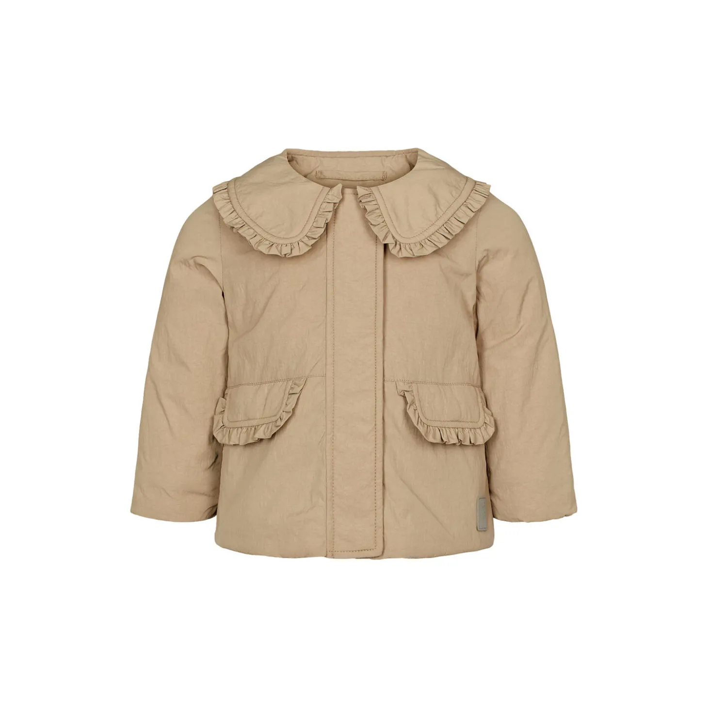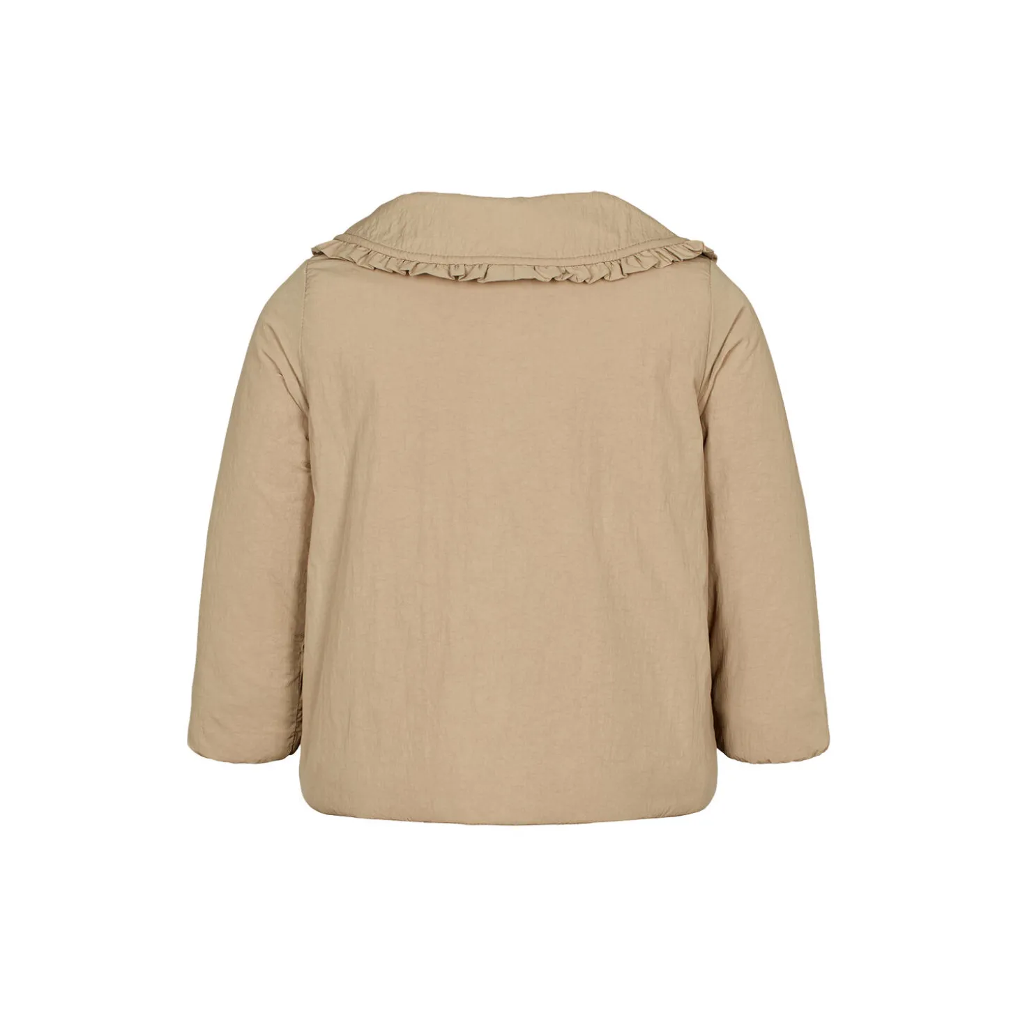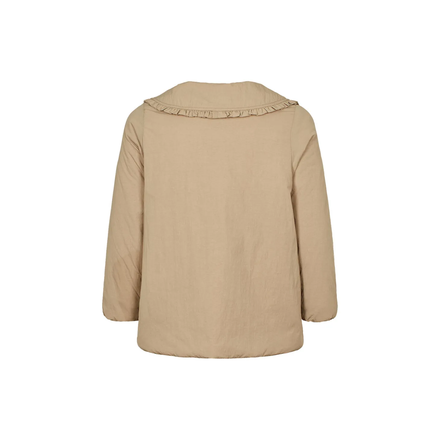 Jakke i termo ridé med krave og flæser for et mere feminint udtryk. Jakken har to lommer og jakken lukkes med lynlås og knapper foran.