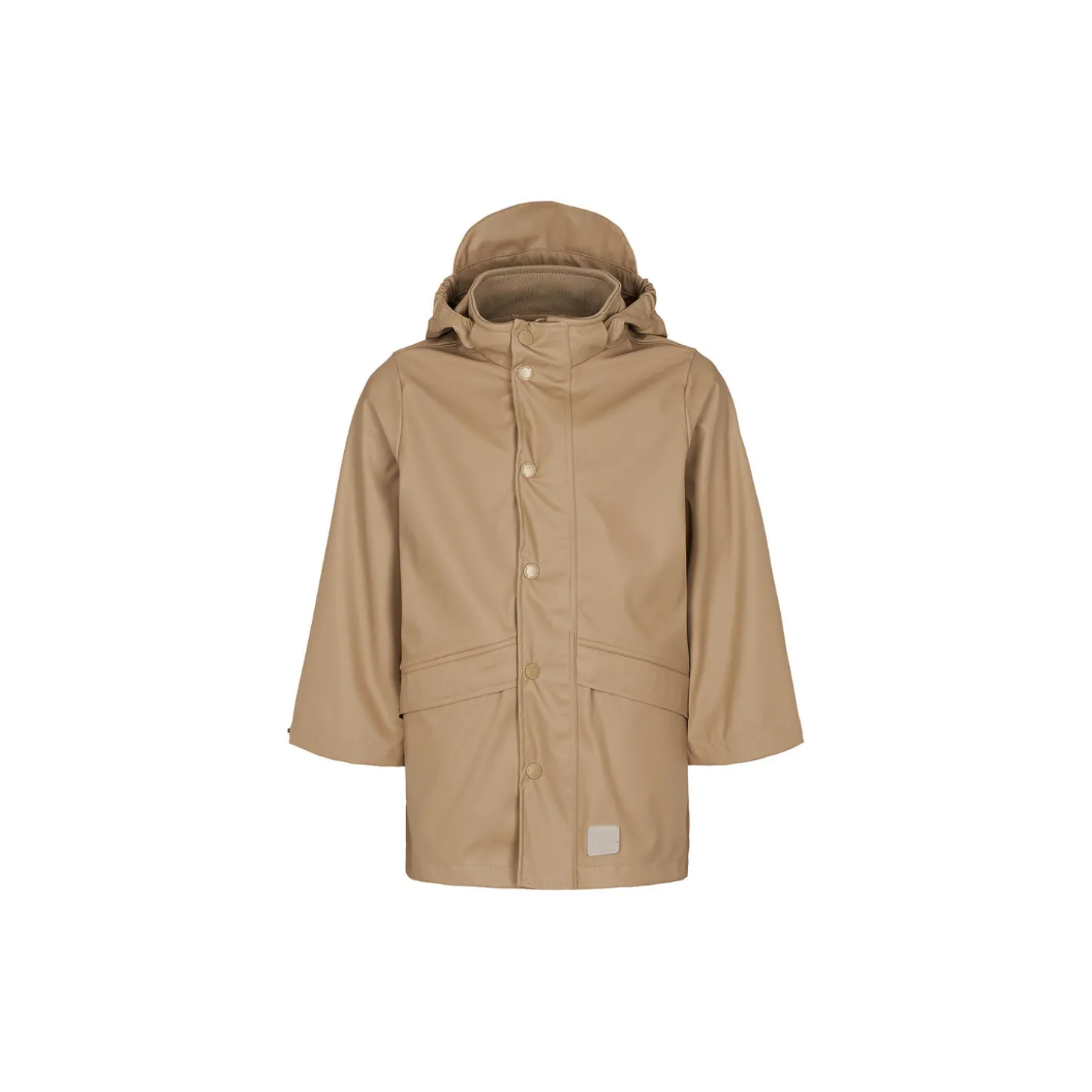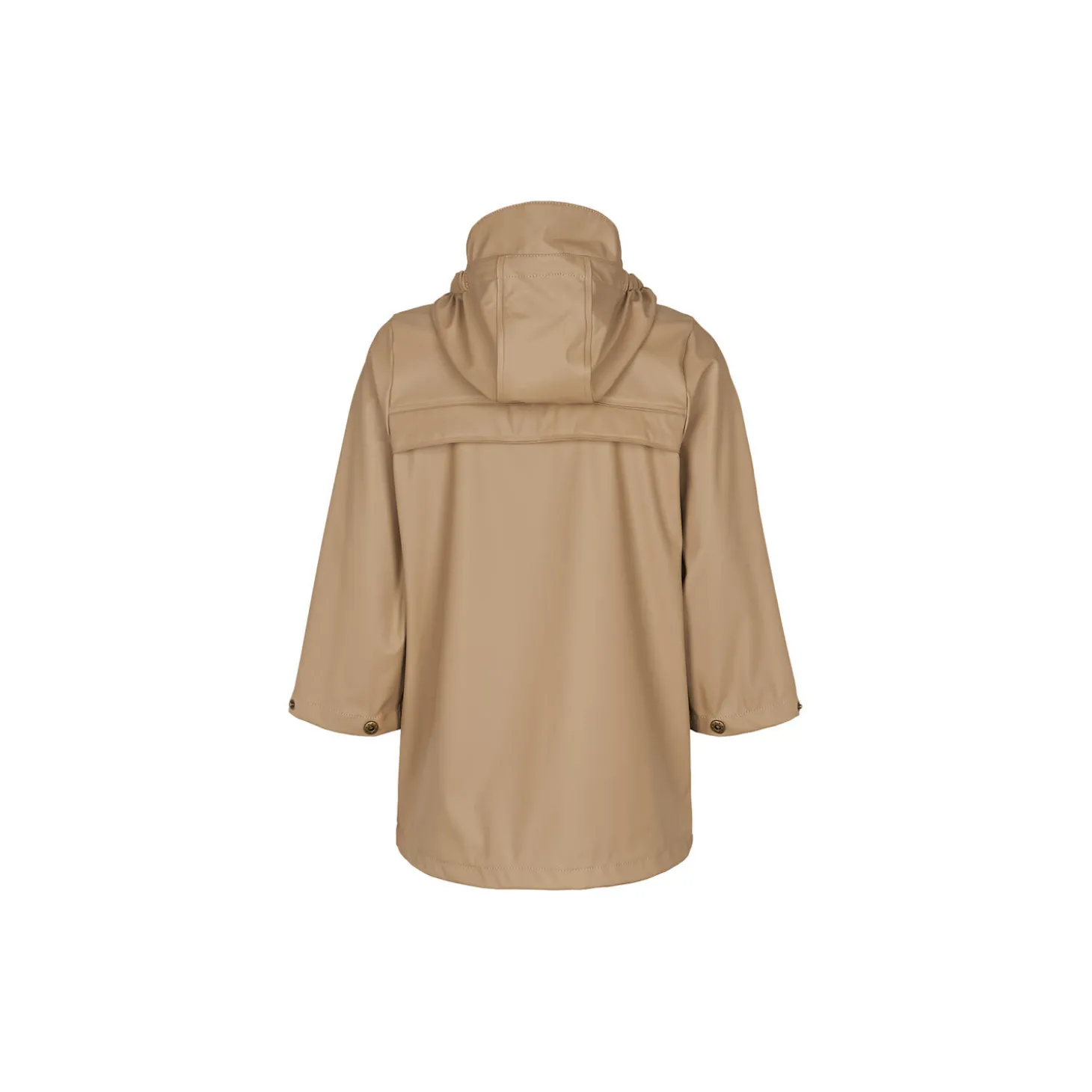 Lang regnfrakke til de lidt større børn med to store lommer og smart aftagelig skyggehætte. Regnjakken lukkes med lynlås og trykknapper og har justerbar ærmeoplægning.