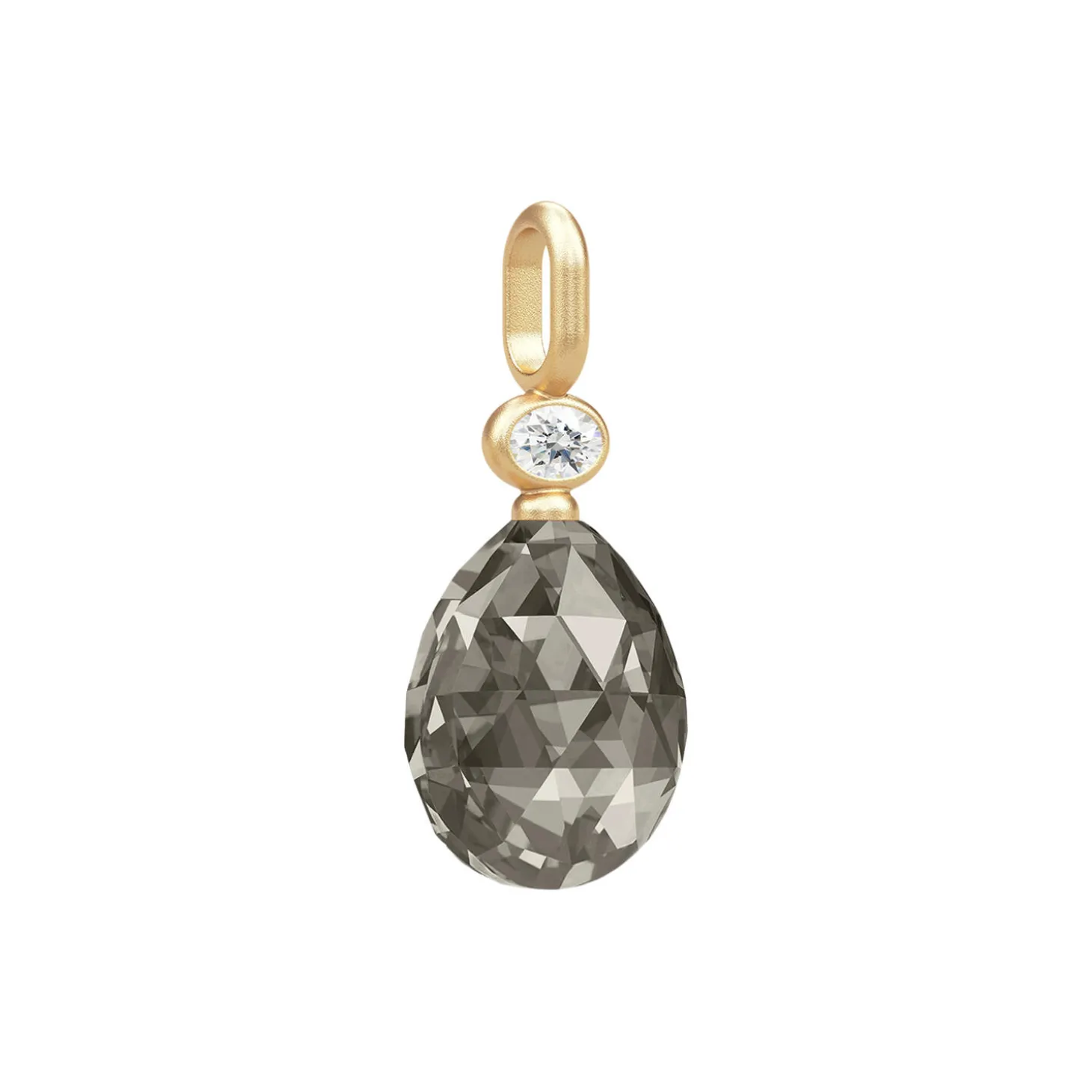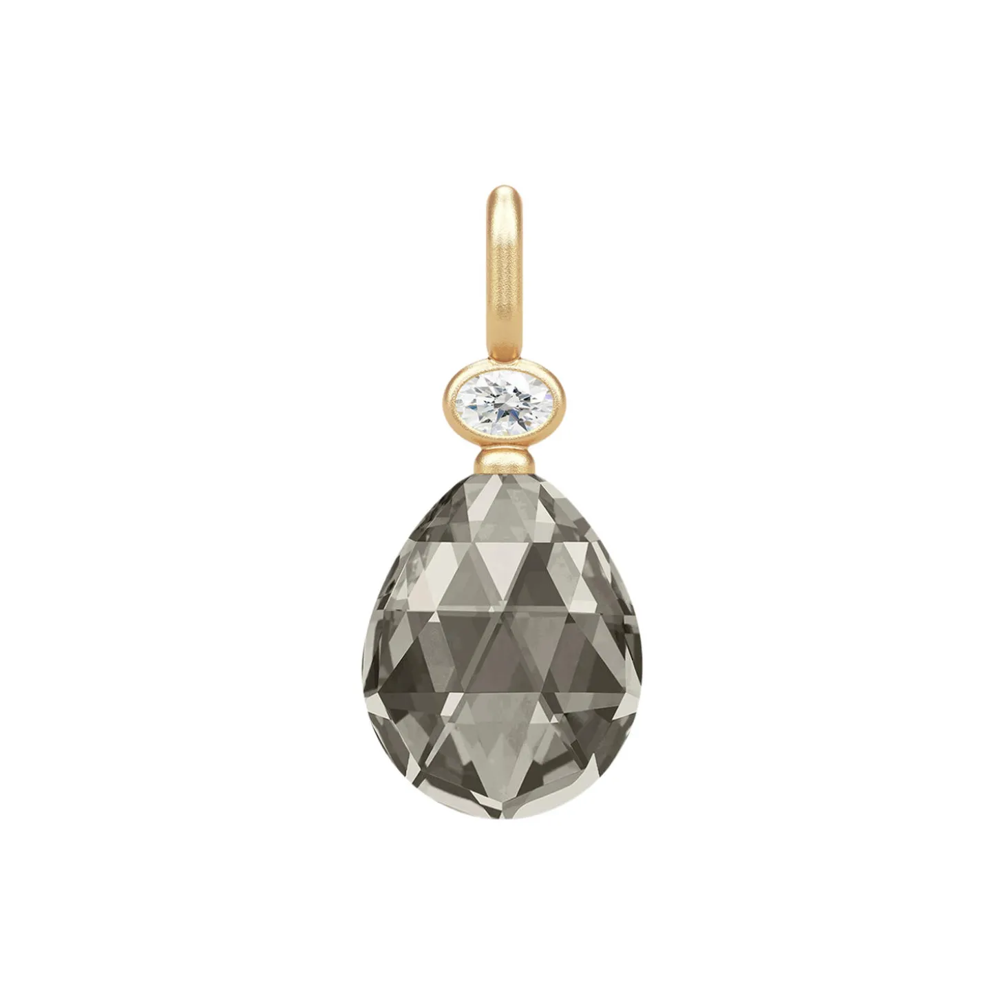 22-karat guldbelagt 925 sterlingsølv, fremstillet af genanvendte metaller. Pyntet med en rosensleben dråbeformet briolet og en hvid oval zirkonia — begge etisk fremskaffede og håndisatte. Afsluttet med et satinpoleret ophæng i matchende guldfinish. Vedhængets mål: 19 × 8 mm. Designet i Danmark. Bæredygtigt fremstillet på vores egen fabrik i Vietnam.