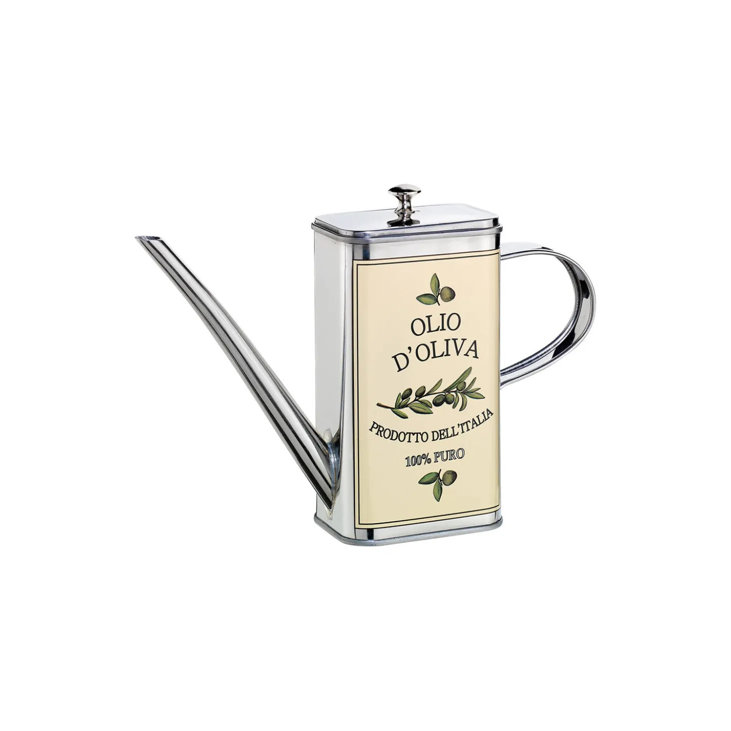 Oliekanden OLIO PURU den er lavet af poleret rustfrit stål, og beskytter din olie mod lys. Tuden sørger for en præcis og drypfri dosering. Kanden er din perfekte ledsager, når du drypper dine bresaola-skiver med citronsaft og olivenolie. Kanden kan fås med andre motiver. Indeholder 500ml.
