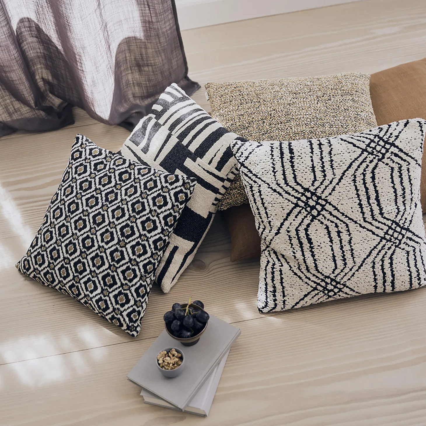 De abstrakte firkanter i sort og hvid, kombineret med den bløde bouclé gør Orion iøjnefaldende, mens den samtidig giver en ro og jordforbindelse til hjemmet. Orions strukturerede mønster tilfører karakter og retro vibes i et moderne hjem. En oplagt pude til det kvalitetsbeviste hjem, og kan nemt sammensættes med andre mønstrede bouclés eller basispuder. Hver Orion pude er unik i udseende. Puden leveres med 100% andedun/-fjer og pudevår i 100% bomuldsbetræk.