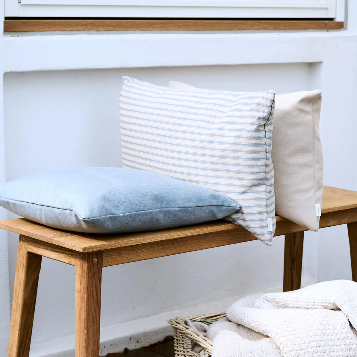 Lækker ensfarvet udendørspude i blå. Mix med puderne Outdoor Stripe og Fine Stripe i dine ynglingsfarver og skab den skønneste oase i haven og på terrassen.Outdoor Basic er lavet i special stof, som er vandafvisende og tåler solens stråler.