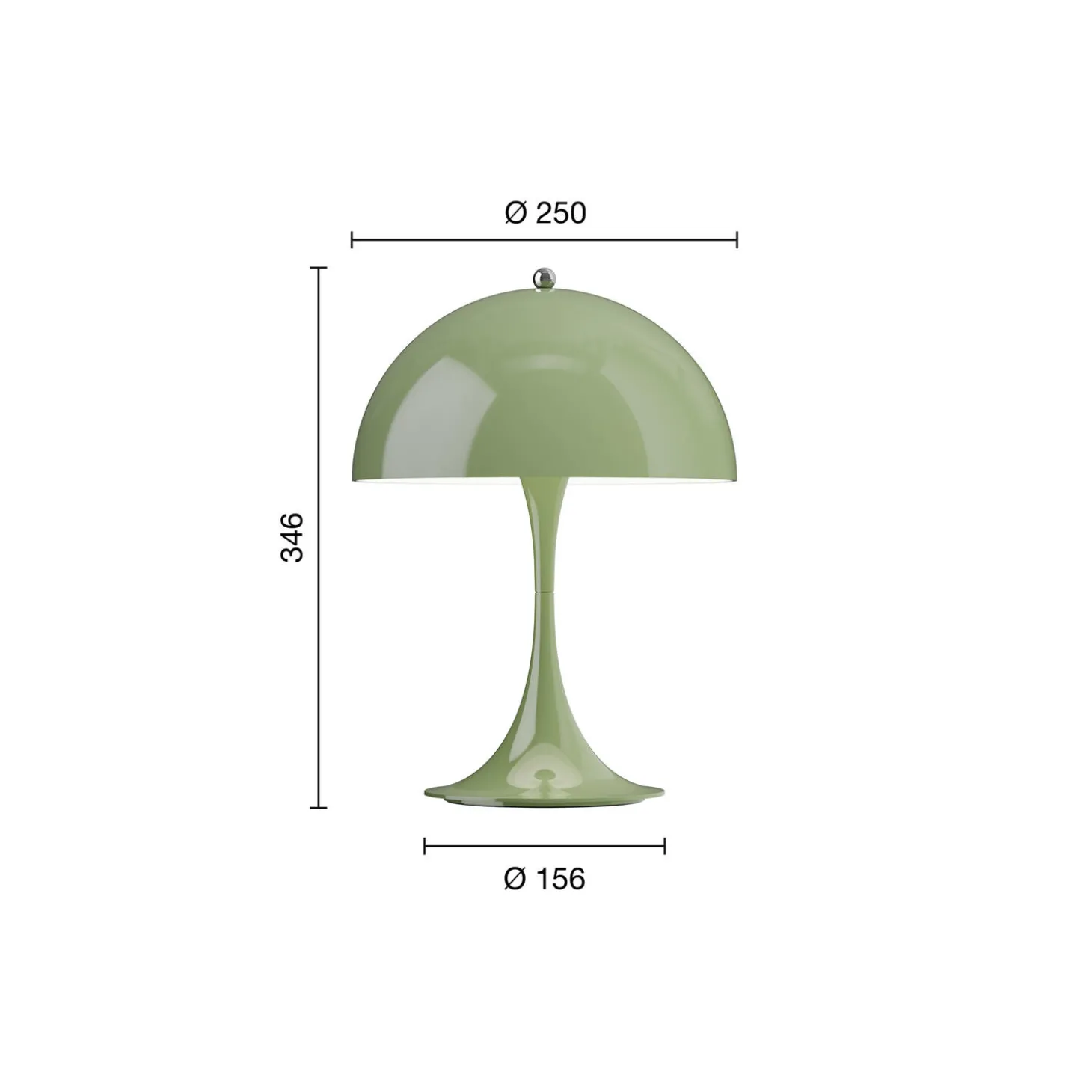 Den bærbare lampe har en hvid akryk opalskærm, der giver et diffust lys, det blændfri lys rettes nedad på den trompetformede fod, der er designet til at reflektere lyset opad.