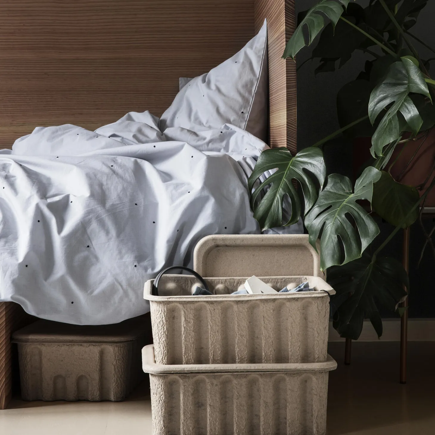 Denne boks med låg er fremstillet af 100 % genanvendt papirmasse, der giver dig en praktisk, let og stabelbar opbevaringsløsning. De holdbare og bionedbrydelige kasser tilbyder et sikkert sted til at gemme tilbehør, bringe orden i dit hjemmekontor eller holde orden i mindre klodser og legetøj i børneværelset.