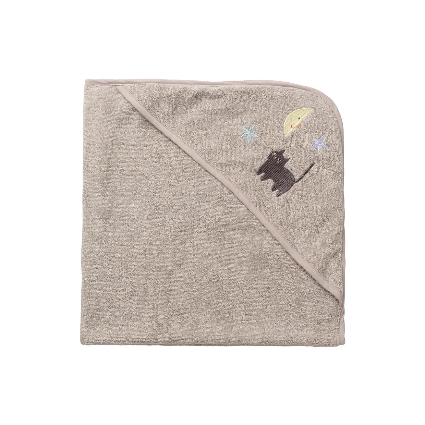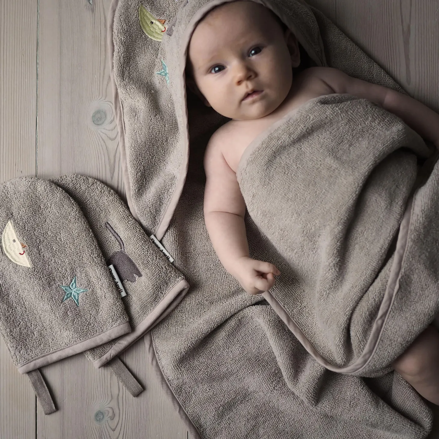 Lækkert vamset babyhåndklæde til de mindste i eksklusiv, tyk og blød frottékvalitet. I det ene hjørne har babyhåndklædet en hætte med et fint broderi inspireret af natur og udeliv.