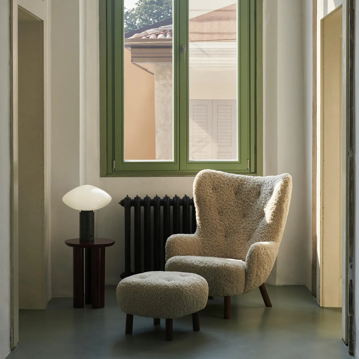 - Materiale: upholstery in Sheepskin Moonlight fabric and frame in oiled walnut
