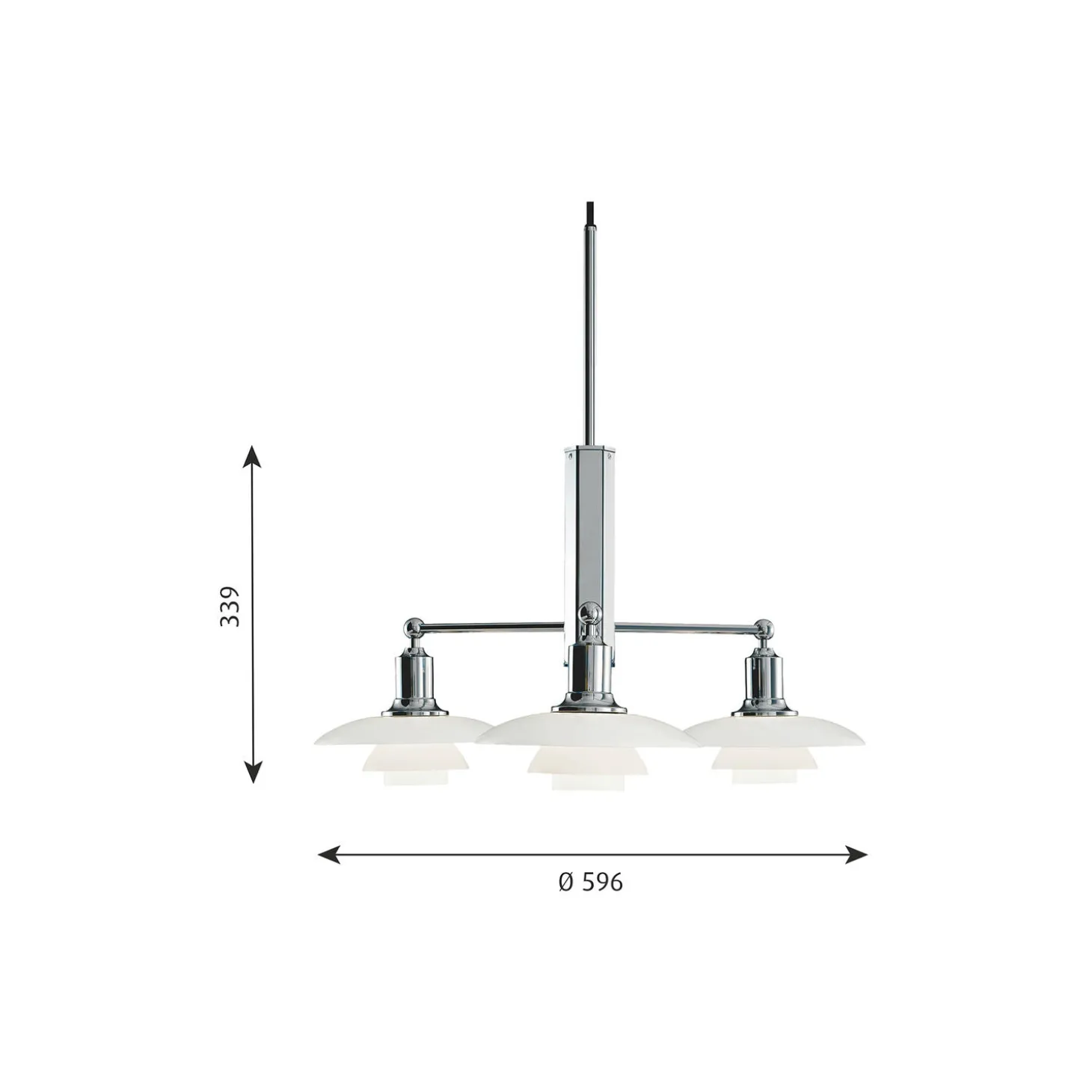 PH 2/1 stammekrone i mundblæst opalglas med stel og fatningshus i højglansforkromet messing og aluminium fra Louis Poulsen. Farve: krom. Mål: H: 33,9 x Ø 59,6 cm. Lyskilde: 3x20W E14. Design: Poul Henningsen.