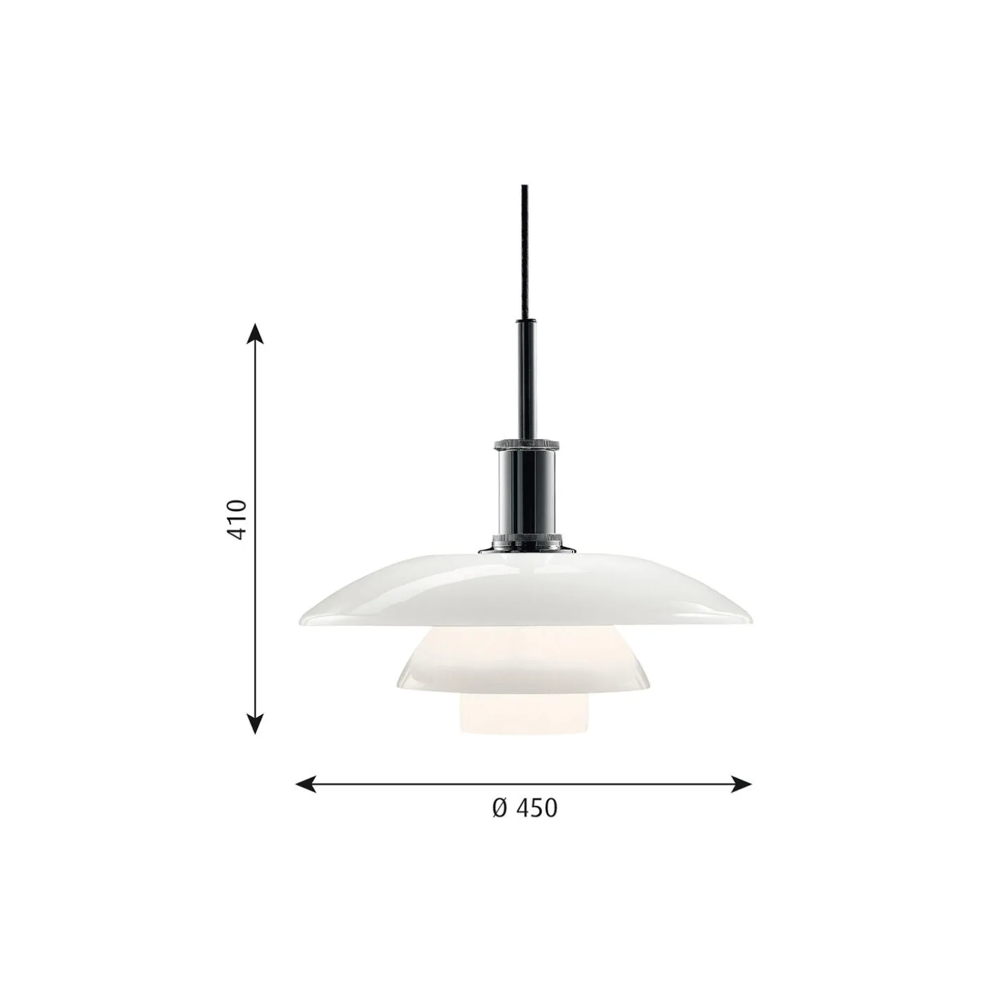PH 4½-4 glas pendel i mundblæst opalglas med fatningshus i højglansforkromet aluminium fra Louis Poulsen. Farve: krom. Mål: H: 41 x Ø 45 cm. Lyskilde: 70W E27. Design: Poul Henningsen.