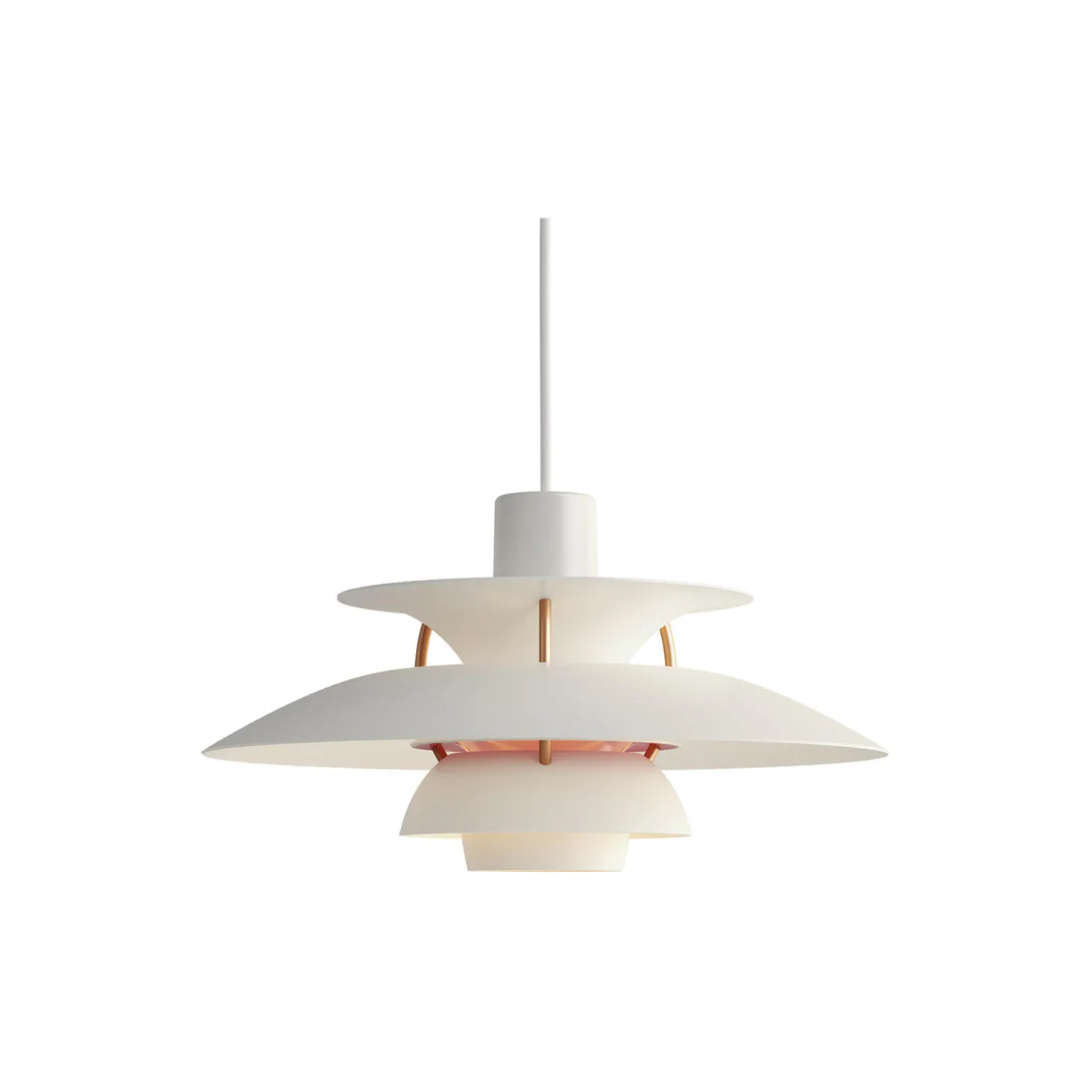 PH 5 Mini pendel i matlakeret aluminium med afblændingsring samt stag i valset aluminium fra Louis Poulsen. Farve: moderne hvid. Mål: H: 16,3 x Ø 30 cm. Lyskilde: 20W E14. Design: Poul Henningsen.